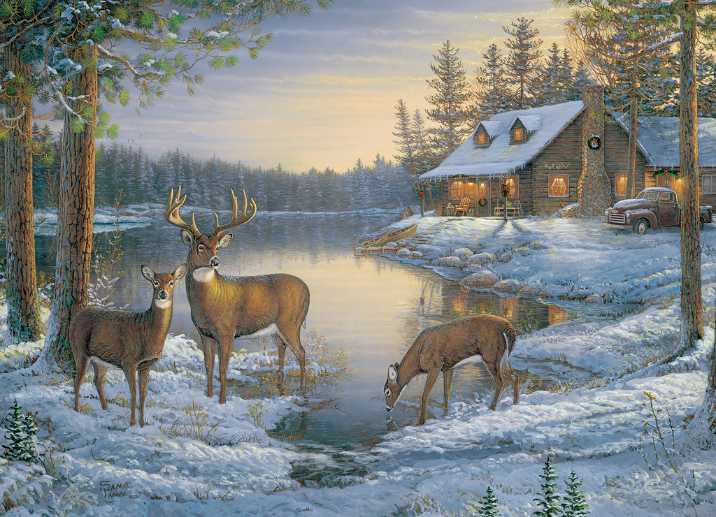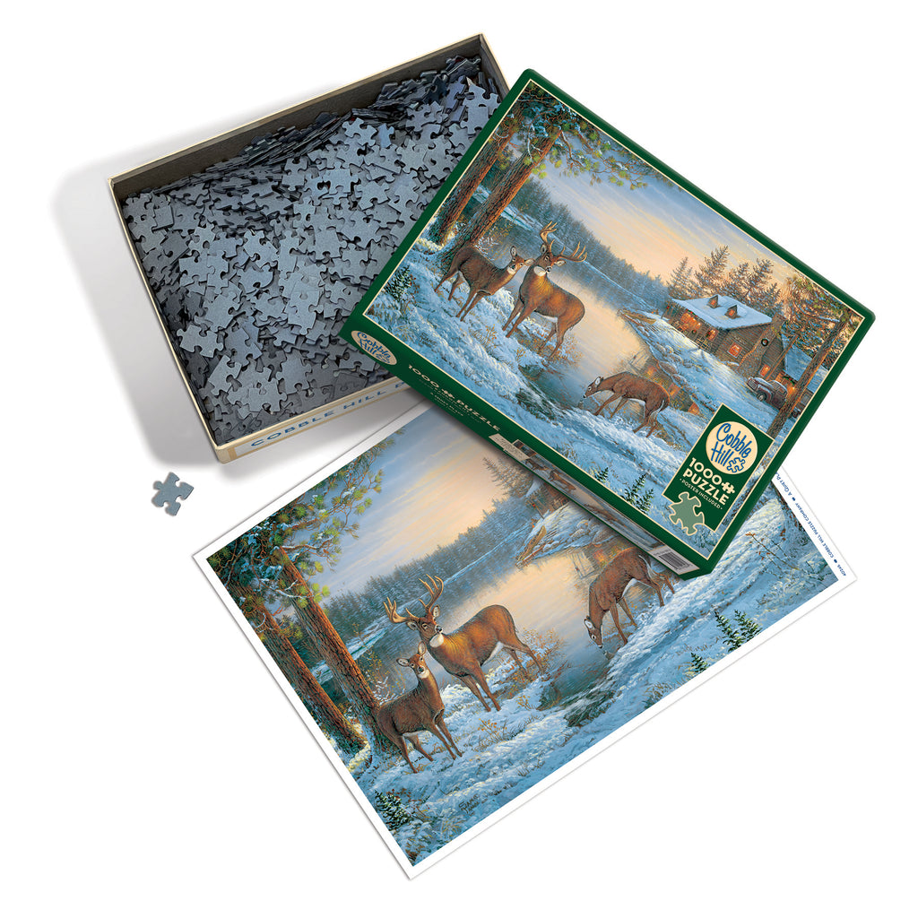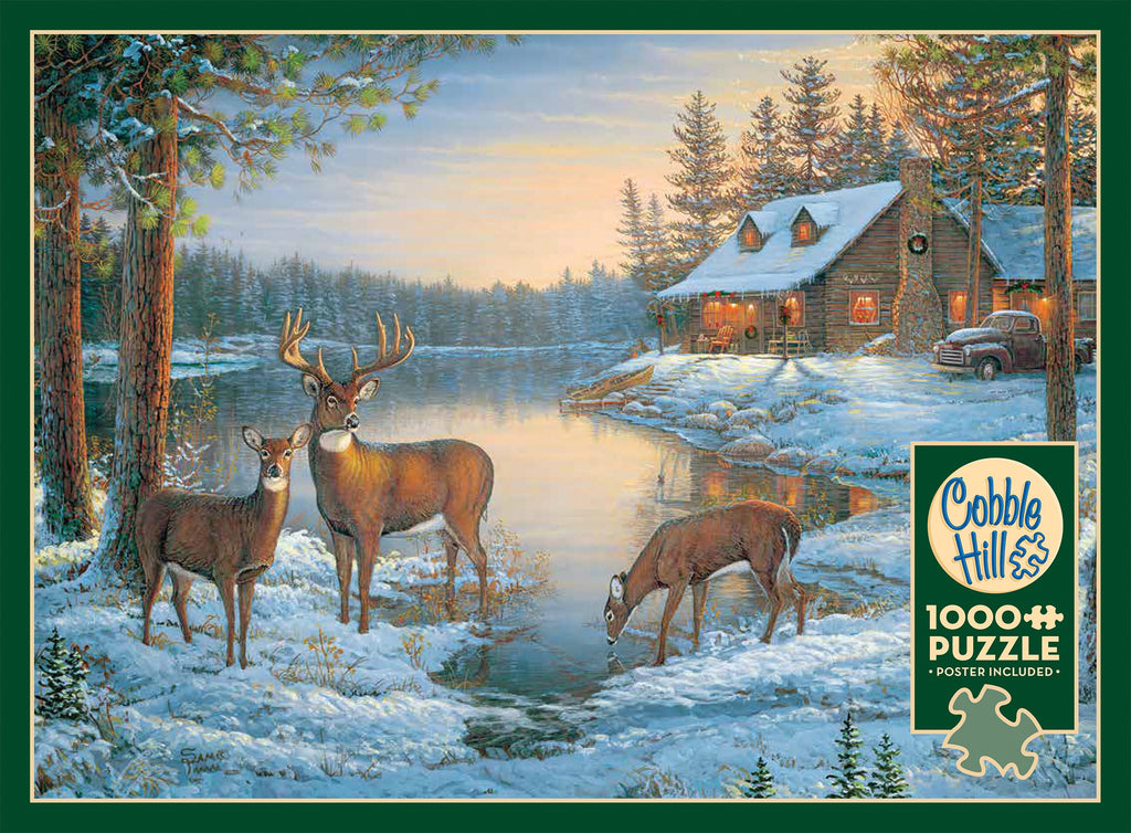 A family of deer feed beside the frozen lake. With everyone inside the warm cabin, the deer can enjoy the peace and quiet of the country air. Maybe everyone is inside enjoying a 1,000 piece puzzle? Cobble Hill puzzles feature interesting random-shaped pieces, so no two pieces are alike. Includes a handy poster.