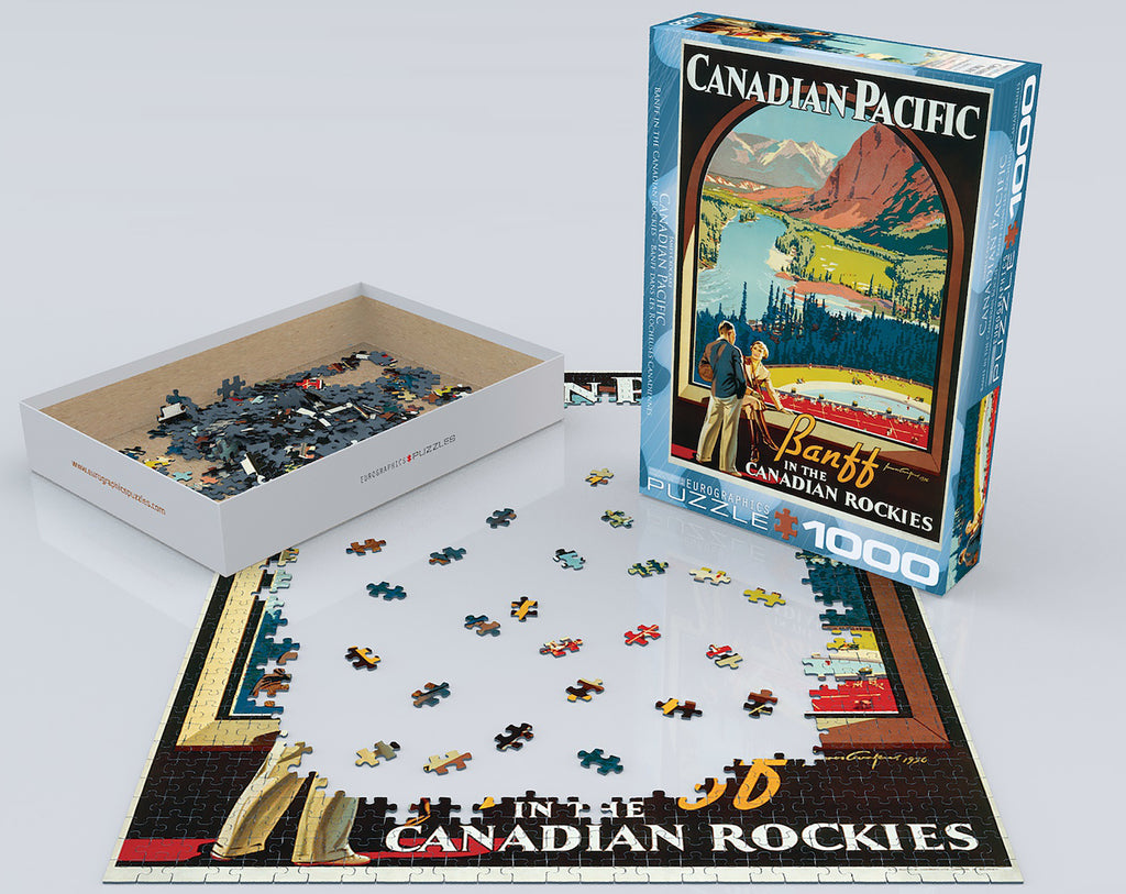 EuroGraphics Banff in the Canadian Rockies by James Crockart 1000-Piece Puzzle. Box size: 10" x 14" x 2.37". Finished Puzzle Size: 19.25" x 26.5". The Banff Springs Hotel is equaled in majesty only by the snow-capped Rocky Mountains that surround it. This icon of Canadian architecture and history has been serving travelers in style since 1888. Strong high-quality puzzle pieces. Made from recycled board and printed with vegetable based ink.