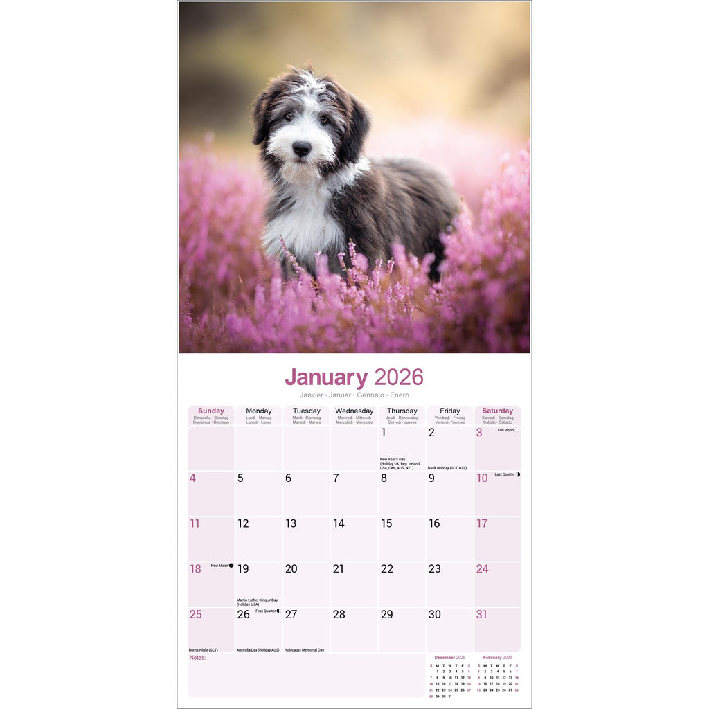 Our 2026 premium Dog Breed calendar features 13 pages in total, 4-months from the previous year at the start on a planner page. Included within are 13 full colour images of Bearded Collies. The Bearded Collie, or Beardie, is a herding breed of dog once used primarily by Scottish shepherds, but now mostly a popular family companion. A boisterous and charismatic droving dog from Scotland, the shaggy-coated Bearded Collie ('Beardie' to his friends) enjoys outdoor exercise in all weather. Bred to be independent decision-makers, they can be willful but are always friendly. Standing 20 to 22 inches at the shoulder and covered head to tail in a shaggy double coat, Beardies bear a passing resemblance to another British favorite, the Old English Sheepdog. Beneath the coats, Beardies are the more lean and angular of the two. The lavish facial hair shouldn't obscure the characteristic expression: a dreamy, faraway gaze. These rambunctious comics can be a handful, but mostly, Beardies are approximately 50 pounds of heart, energy, and laughter. Well-socialized Beardies will get on nicely with other animals and kids. They bore easily, and training must be kept interesting. Outdoorsy families looking for a sturdy dog to share an uptempo lifestyle will never find a more affectionate and amusing sidekick. Featuring a large grid for entering important dates. Multilingual grid, English, French, German, Italian & Spanish. 24 inch x 12 inch (610mm x 305mm) open - 12 inch x 12 inch (305mm x 305mm) closed. This attractive premium quality calendar is a UK publication, PRINTED ON FSC PAPER AND PLASTIC FREE PACKAGING. Treat yourself or choose as a thoughtful gift. Would enhance any dog lovers home!