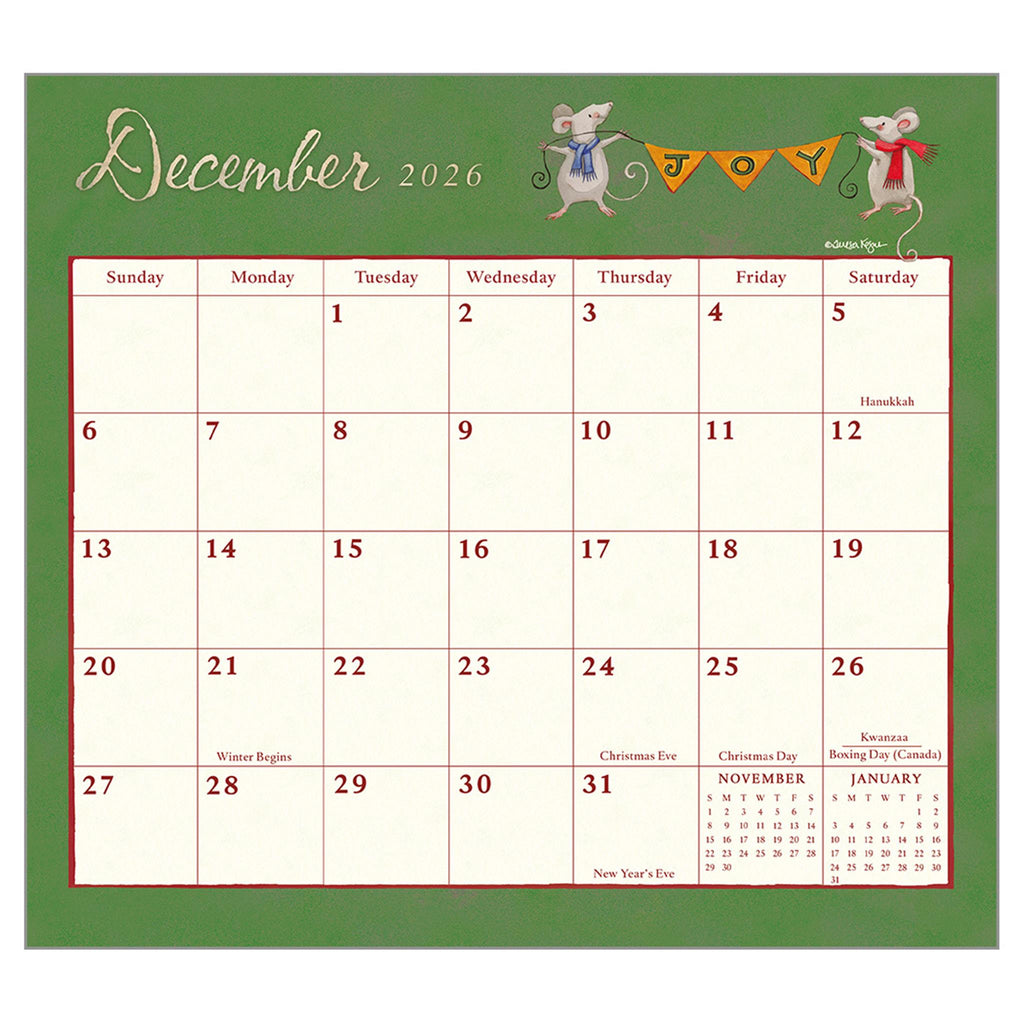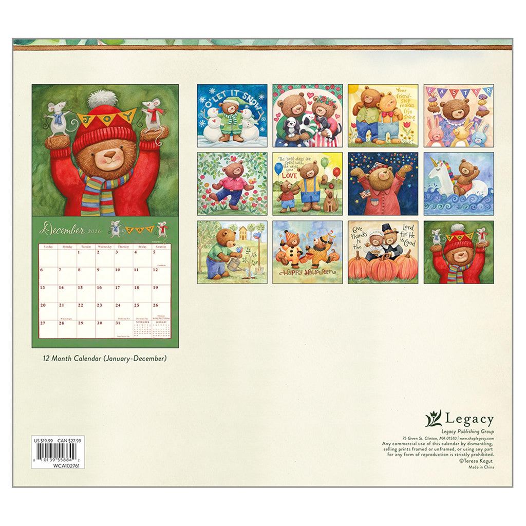 This 2026 Legacy Wall Calendar features adorable, cuddly, teddy bear artwork from renowned American artist, Teresa Kogut. Each 12-month calendar is printed on premium, linen-embossed paper that has a distinctive, luxurious feel to it, and comes in a protective sleeve. The date pad is uniquely designed for each calendar title to complement the artwork. The last page contains a 2-year calendar (2026/2027) and space for notes. Brass gusset on front cover for added durability.