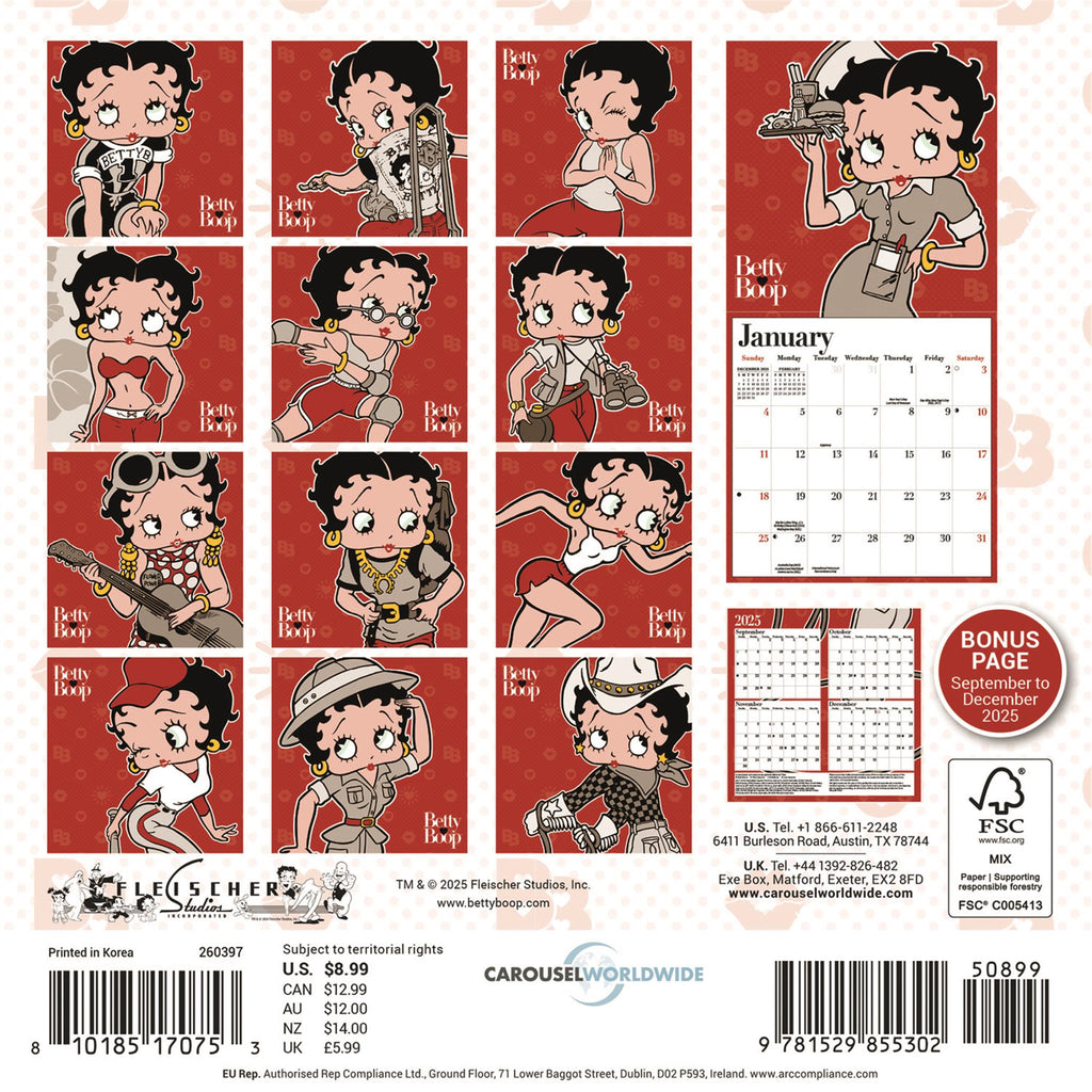 Let the iconic Betty Boop take her place in your home with this lovely mini calendar for 2026. The gorgeous retro illustrations are sure to add a touch of glamour to any wall. The calendar has a handy date grid every month and is free of plastic packaging.