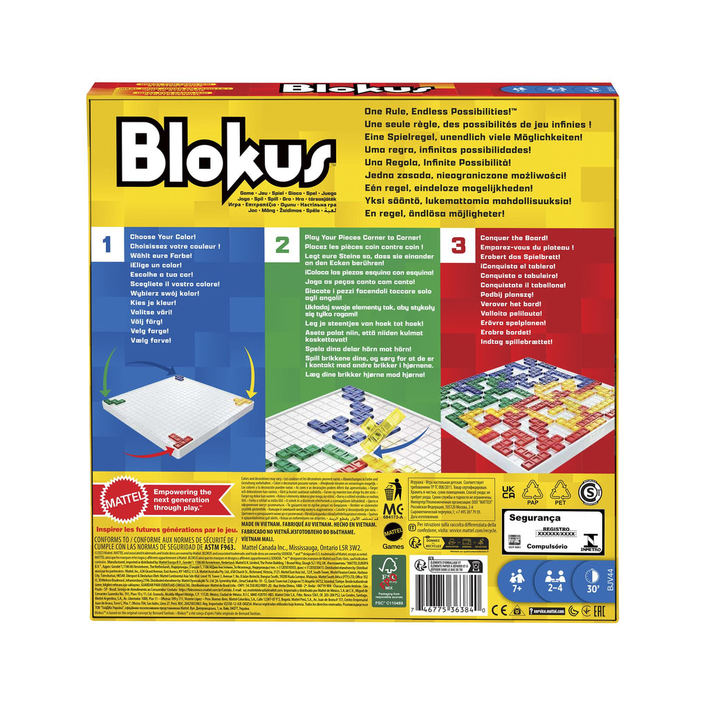 Stake your claim and protect your territory with the Blokus™ game! It takes less than a minute to learn, but offers endless strategy and fun challenges for the whole family. Each player gets a set of 21 pieces – in red, blue, green, or yellow – then takes turns placing them on the board. There’s just one rule: each piece you play must touch at least one other piece of the same color, but only at the corners! The goal is to fit the most pieces on the board. The game ends when no more pieces can be placed down, and the player with the lowest number remaining wins! Approximately 30 minutes of playtime. For 2-4 players. Ages 7 and up.
