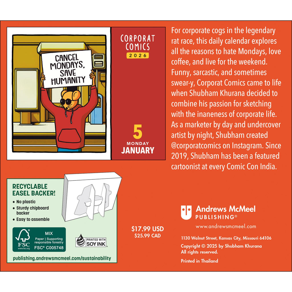 Hard-hitting and sarcastic, this calendar's funny comics are for keyboard strikers––whether you work from home or on site at the office––who are not afraid to laugh at themselves. Corporat Comics came to life when Shubham Khurana, aka @corporatcomics on Instagram, a marketer by day and undercover artist by night, decided to combine his passion for sketching with the inaneness of corporate life. Features include: No single-use plastic. Page size 5.4 x 4.5 in. Box size 5.9 x 5 in. Recyclable chipboard easel backer for desk or tabletop display. Printed on FSC® certified paper with soy-based ink. Full-color tear-off pages. Back of pages are blank for notes or shopping lists. Day/Date reference on each page. Combined weekend pages. Official major world holidays and observances. WARNING: These edgy, relatable comics will NOT motivate you!