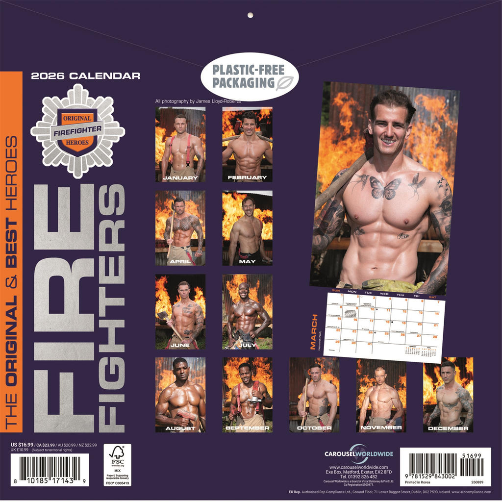 Full of real-life hunky firefighters, this 2026 wall calendar is hot! Each month features a new handsome hero to enjoy. This calendar is free of plastic packaging.