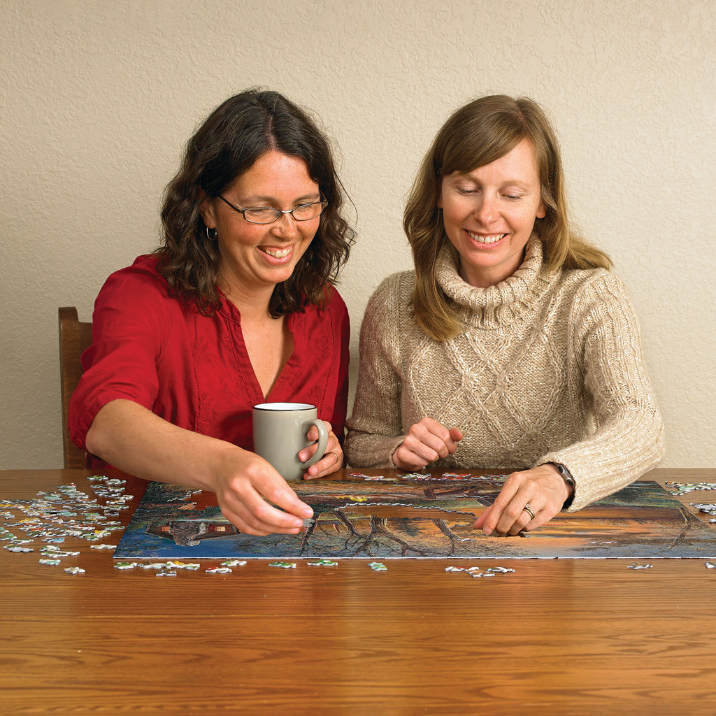 The lonely Adirondack chairs encircling the campfire eagerly await their first visitors. Will they bring hot dogs for a wiener roast? Or maybe it will it be s'mores tonight? Hopefully there will be some ghost stories too. Spending time fireside by the warm campfire is the best part of a weekend at the cabin. Cobble Hill puzzles feature interesting random-shaped pieces, so no two pieces are alike. Includes a handy poster.