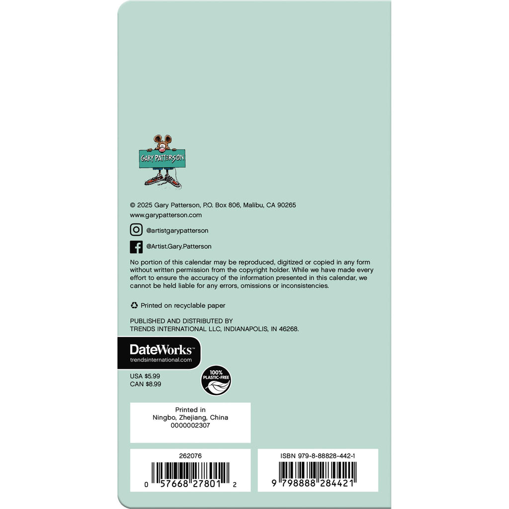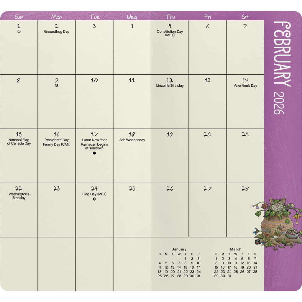 Cartoonist Gary Patterson and his captivating cats will capture your heart in the 2026–2027 Gary Patterson Cats Pocket Planner. Who doesn’t want a clever kitty to carry around in their pocket? Two-year pocket planners feature monthly calendar spreads for August 2025 to December 2027. Each page highlights federal holidays and moon phases, with daily blocks for jotting down tasks and appointments. Extra notes pages are included to help you stay organized. Compact, portable, travel-size planner is the perfect size for your purse, pocket or backpack. Includes a durable, eco-friendly, plastic-free cover.