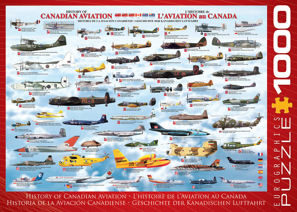 EuroGraphics History of Canadian Aviation 1000-Piece Puzzle. Box size: 10" x 14" x 2.37". Finished Puzzle Size: 19.25" x 26.5". A comprehensive look at the history of Canadian aviation from the early years to the modern era. Strong high-quality puzzle pieces. Made from recycled board and printed with vegetable based ink.