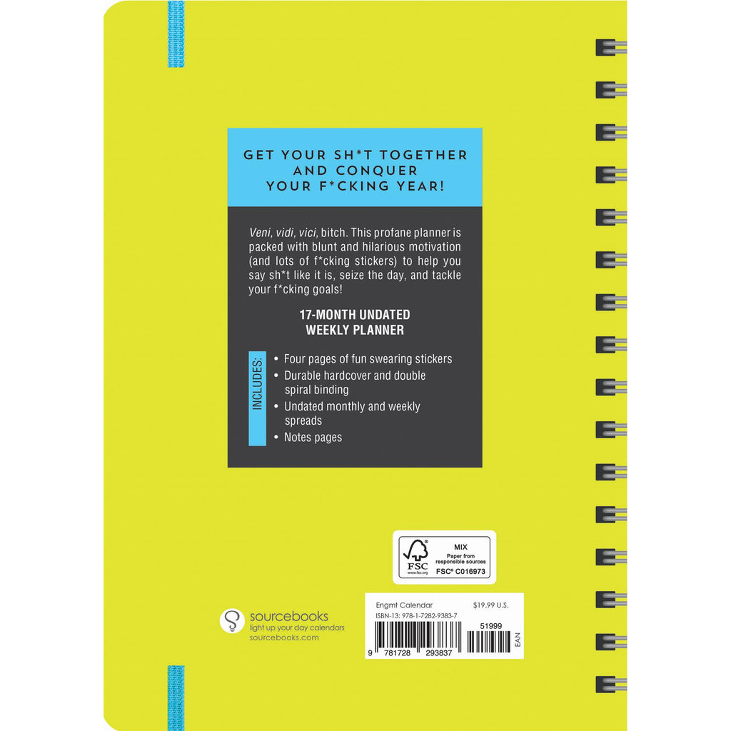 Wake up, kick ass, and conquer your year with this f*cking undated planner!VENI, VIDI, VICI. Get your sh*t together with a sarcastic and humorous swear planner that says it like it is while keeping you organized. Packed all year with motivational profanity and lots of funny swearing stickers, this undated engagement calendar will help you seize the day like a badass, keep track of important appointments and events, and tackle your damn goals - maybe swearing will help! Get f*cking inspired this year or give as the perfect gifted organizer for the women or men in your life! The planner includes four monthly planner stickers sheets with over 350 funny and practical swear word journal stickers for adults. It's a 6x8 planner with durable hardcover and double spiral wire-o binding with an elastic band closure. It's environmentally responsible with FSC certified paper.