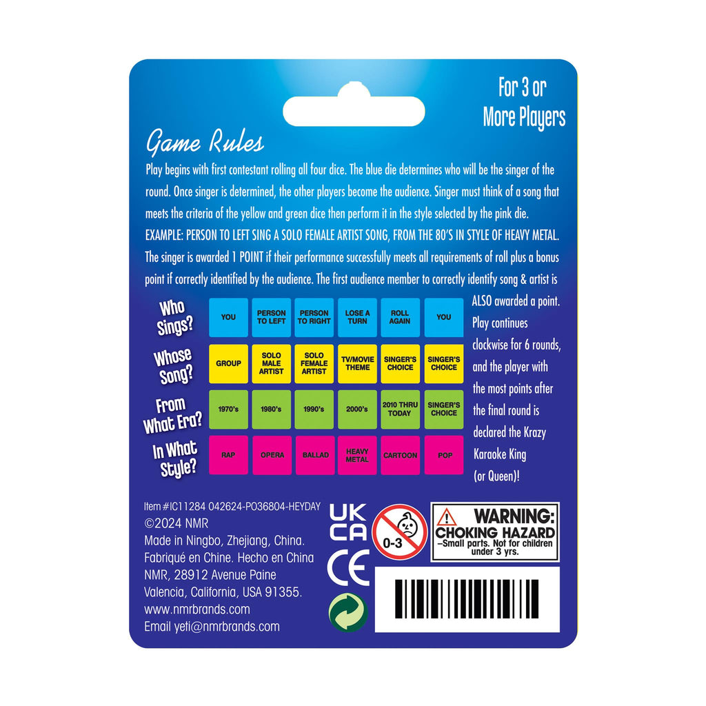 Krazy Karaoke Dice Game: Can't decide on a track? Bring an extra layer of fun to your karaoke nights with these dice! Who's going to sing? From what kind of artist? what decade is the song from? What style of song? Roll the dice and find out!