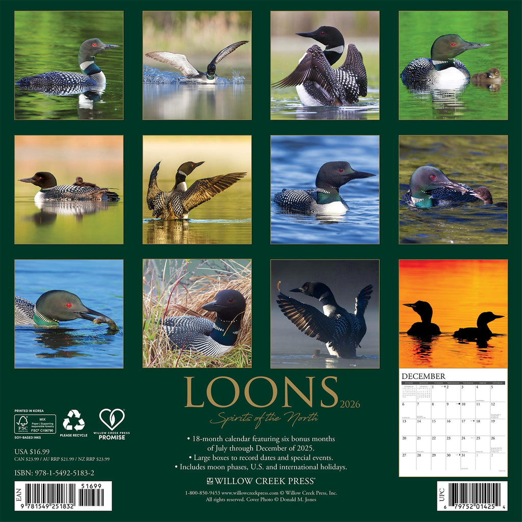 Common loons, whose haunting calls rivet lakeside listeners, are known as "Spirits of the North". Twelve magnificent full color photographs depict these beloved birds in their natural, North American habitat. Stay organized in the upcoming year with a Willow Creek Press 2026 12" x 12" Wall Calendar. This calendar features large grids for easy notation of dates and events, helping you stay efficient and on top of your commitments. Let this calendar guide you to a more organized, successful and fulfilled year ahead. PERFECT GIFT - Look no further for the perfect gift for any special occasion. Make someone's year extra special with one of our 2026 Wall Calendars. Our calendars are the perfect choice for your friends or family, even for those difficult to buy for. PLANNING - Stay organized and inspired throughout the year. Ideal calendar for taking notes, recording dates to remember, tracking appointments and assisting in family activity organization. INCREDIBLE IMAGES - Crisp, detailed full-color images every month providing Wall art for Home, Office or School. LARGE GRIDS - 12" x 12" format, with large daily blocks providing ample writing room. SUPERIOR QUALITY - High quality paper stock that lays flat when hanging and offers crisp, bright colors. MONTHLY OVERVIEW - Plan ahead or look back with grids of the upcoming and previous months at a glance. ECO FRIENDLY - Willow Creek Press is committed to eco-friendly efforts to make our products more sustainable, our 2026 12" x 12" wall calendars are printed with soy-based inks on high-quality FSC certified paper for smooth writing. DATE RANGE - 2026 Wall Calendar with 6 bonus months from July-December 2025. BONUS FEATURES -US and International holidays and moon phases (CST) noted on each month for easy tracking. This year can be your most successful yet, with this beautiful and brilliant wall calendar. Learn how to become a highly effective person, one month at a time!