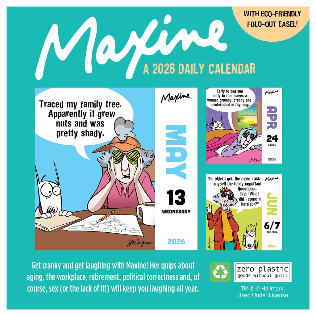 Get cranky and get laughing with Maxine! Her quips about aging, the workplace, retirement, political correctness and, of course, sex (or the lack of it!) will keep you laughing all year. The 2026 daily desk calendar (January 2026 - December 2026) is 5.25" x 5.25" and comes with a foldout easel to sit on your desk. The daily pages (weekends combined) easily tear off with a humorous Maxine illustration on the front and the reverse side is lined for notes. Calendar comes packaged in a wraparound cover. This product contains no plastic and is printed on FSC-certified paper.