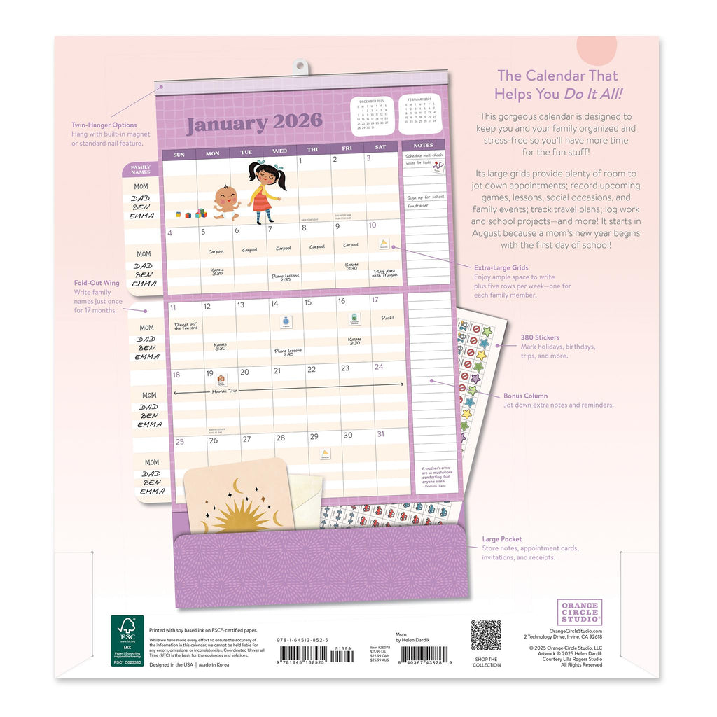 Manage even the busiest schedule with the easy-to-use Mom Do It All Calendar from Orange Circle Studio. The large grid provides plenty of space to jot down appointments and reminders. Write up to five family members' names on the fold-out wings to keep track of everyone's important events throughout the year, and store receipts, tickets, and more in its handy pocket. Use the more than 300 stickers to mark holidays, appointments, and other important dates. With a strong magnetic hanger, you can mount this calendar on any magnetic surface or use the traditional nail hanger. Unique illustrations and designs adorn every page, with the artist benefiting directly from each calendar purchased, further supporting creative communities around the globe.