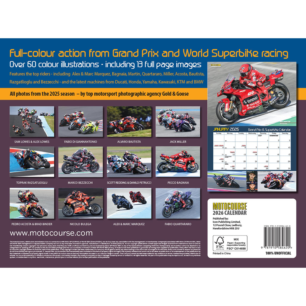 The 16 x 12 inch Motocourse Grand Prix and Superbike Calendar contains stunning images from both the MotoGP and World Superbike championships. Brilliant motorcycle action photographs are provided by top motor sport photographic agency Gold & Goose, and cover all the major racing teams including Ducati, Yamaha, KTM, Aprilia, Kawasaki and BMW. They are selected exclusively from races held in the Grand Prix season. Also featured are portraits of the current riders including Moto GP champions Pecco Bagnaia, Marc Marquez and Jorge Martin, as well as top Superbike stars, including Alvaro Bautista, Nicolo Bulega and Toprak Ragatlioglu. All current riders dates of birth are also shown on the calendar pages. The large format wall calendar is conveys brilliantly the vivid color and glamour of motor cycle racing.