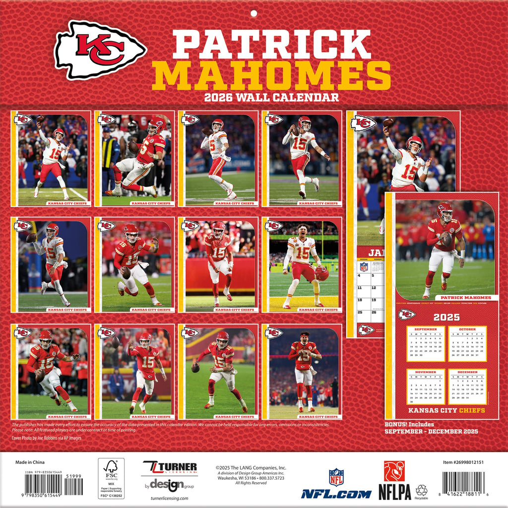 NFL Patrick Mahomes Kansas City Chiefs 2026 Wall Calendar