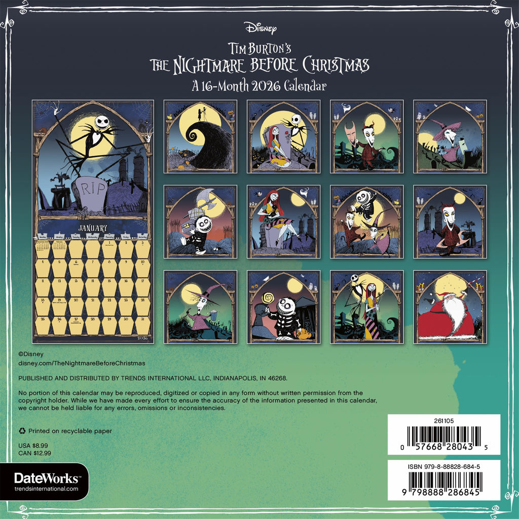 You don’t have to wait until Halloween and Christmas to hang out with Jack Skellington and his spooky friends in Halloween Town. Schedule your trip to Christmas Town anytime with this 2026 Nightmare Before Christmas Mini Calendar. It’s packed full of holidays to take over all year long. Ideal for limited wall space, 16-month mini calendars feature monthly pages for January to December 2026, as well as a page combining the last four months of 2025. Each monthly page includes federal holidays and moon phases, with daily blocks for jotting down tasks and appointments to help you stay organized. Features 13 high-quality images in a compact size, printed on premium paper certified by the Forest Stewardship Council. Perfect for hanging in school lockers, RVs or campers, small office cubicles and dorm rooms.