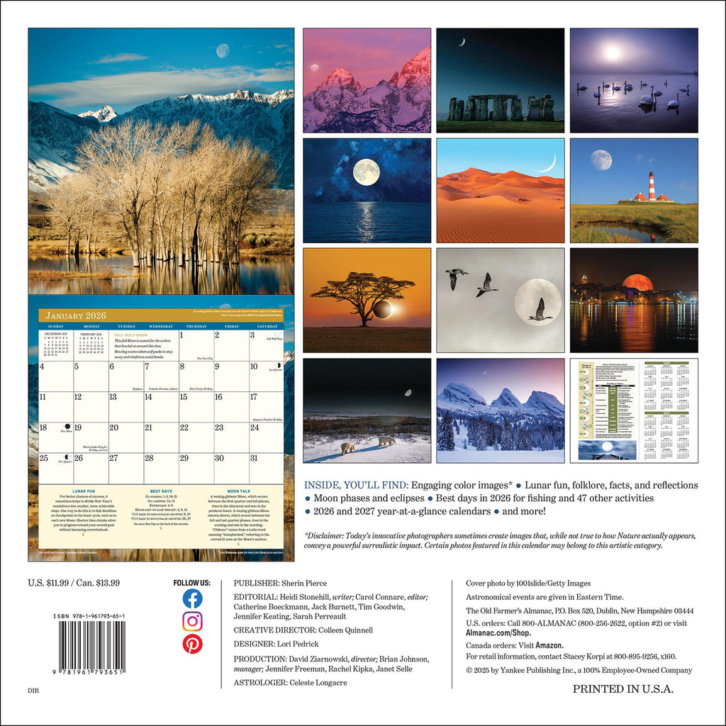 Admired by users for a full decade, this stunning wall calendar brings to light fascinating facts and features about the Moon, our nearest neighbor in space. And who better to bring you these treasures than the Old Farmers Almanac, which for 234 years has enabled millions to experience the wonders of the sky. Enjoy a dozen spectacular images that show Earth's natural satellite in beautiful settings! Explore fun lunar facts and lore on topics such as Where can we see a glitter path? Can anything grow in lunar regolith? Who was a Roman goddess of the Moon?