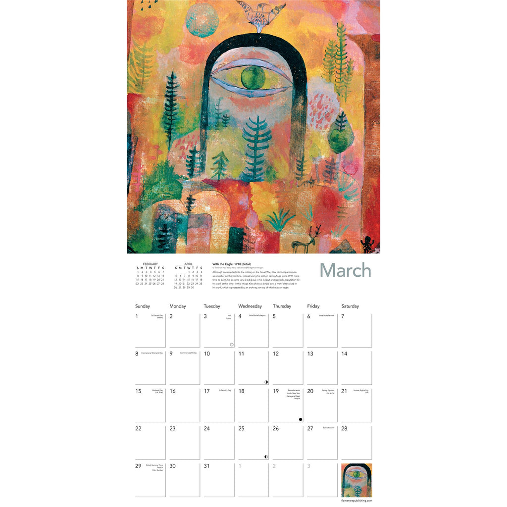 Paul Klee was one of the most inventive artists of the twentieth century. Influenced by Surrealism, Cubism and Impressionism, he had an undoubtedly distinctive style. A keen student of colour theory, his works are powerfully effective, and this calendar features a fantastic selection, including pieces such as City R, Super Chess, and Window in the Garden. Informative text accompanies each work and the datepad features previous and next month’s views. Printed on FSC-certified paper, with plastic-free packaging.