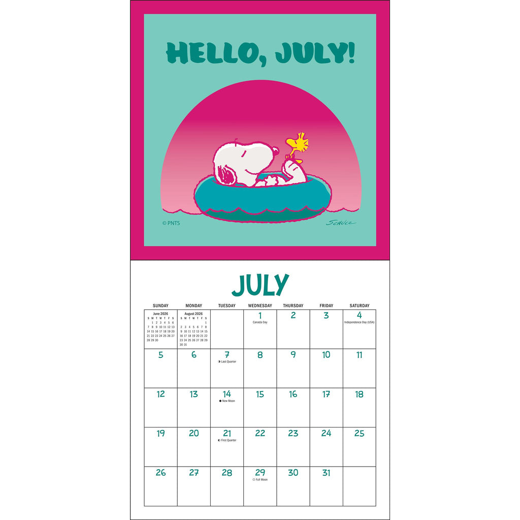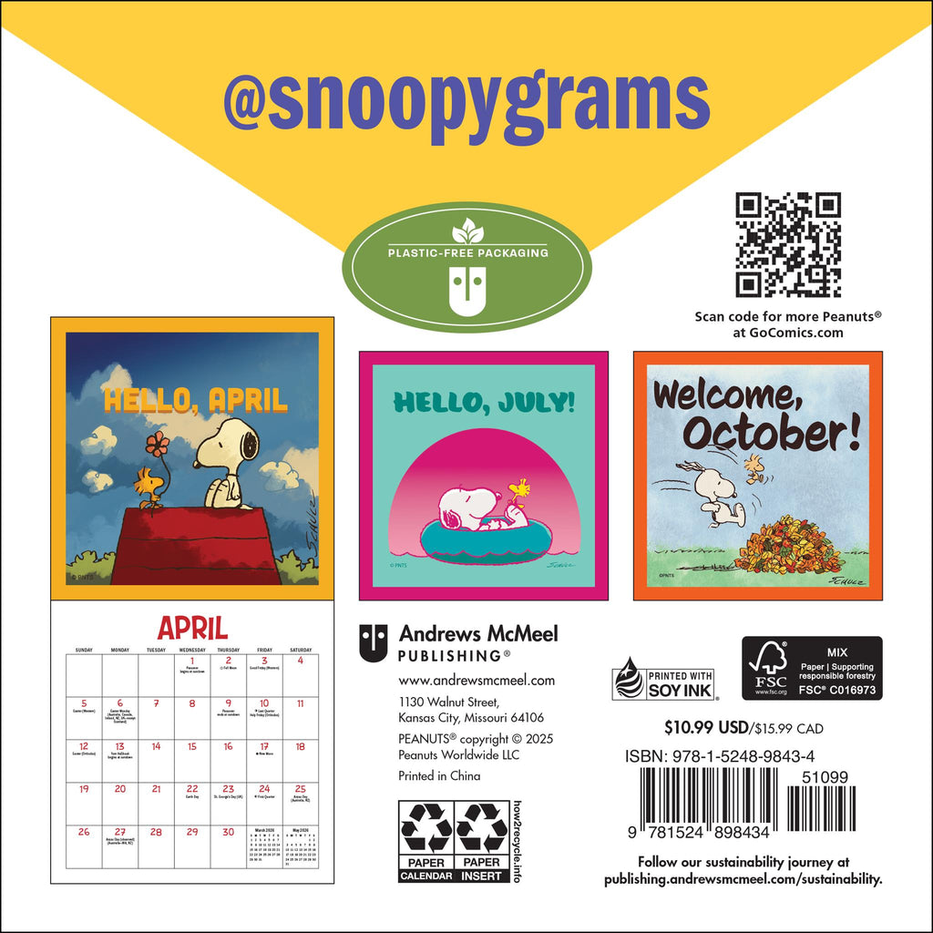 The @Snoopygrams 2026 Mini Wall Calendar features fun and colorful images of SNOOPY and other PEANUTS® characters embracing each month of the year in their own special way. It's perfect for an office or anywhere space is limited. Features include: Fold-around cover design eliminates need for plastic packaging. 7" x 7" calendar (7" x 14" open); great size for small spaces, refrigerators, or office cubicles. Printed on FSC®-certified paper with soy-based ink. Planning spread for September–December 2025. Spans January-December 2026. Grid space for notes, appointments, and reminders. Official major world holidays and observations. Moon phases, based on Universal Time. A fun and colorful image of Snoopy and/or another lovable Peanuts character(s) each month.