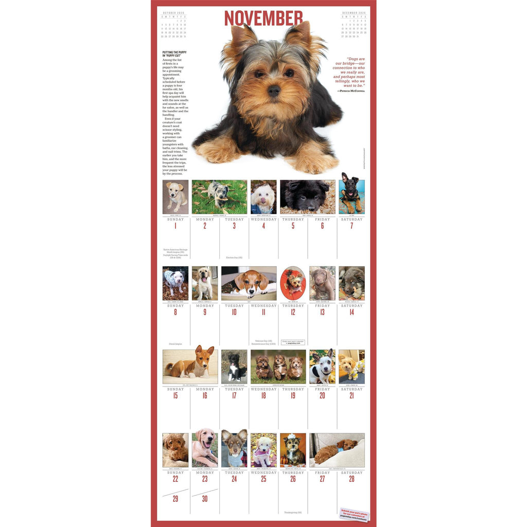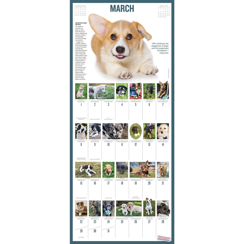 Hundreds of puppies! Each month of this Picture-a-Day wall calendar features more than 20 reader-submitted photos on the grid, plus facts about young dogs' behavior and care.