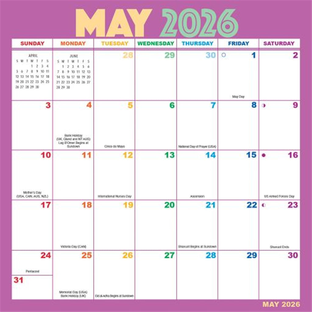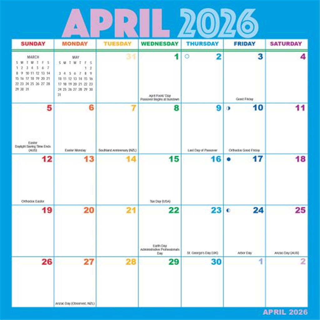 Imagine, no more worrying about damaging your walls or forgetting important dates. With our Magic Grip Wall Calendar, you can reposition it numerous times on dust-free surfaces. Perfect for your home, kitchen, or office! But that's not all! Each month unveils a new rainbow design, adding a burst of color and joy to your days. Plus, personalizing your calendar has never been easier. Use different colors for birthdays and anniversaries, add your own stickers or sticky notes for quick reference, or create your own system of symbols and abbreviations. At Calendars.com, we're all about helping you stay organized in style. And with the Rainbow Magic Grip Wall Calendar, you get functionality, convenience, and a dash of fun. Plus, our selection of calendars is unmatched. So why wait? Add a little magic to your year with the Rainbow Magic Grip Wall Calendar. But hurry, these calendars are flying off the shelves! Order yours today and let's color this year together.