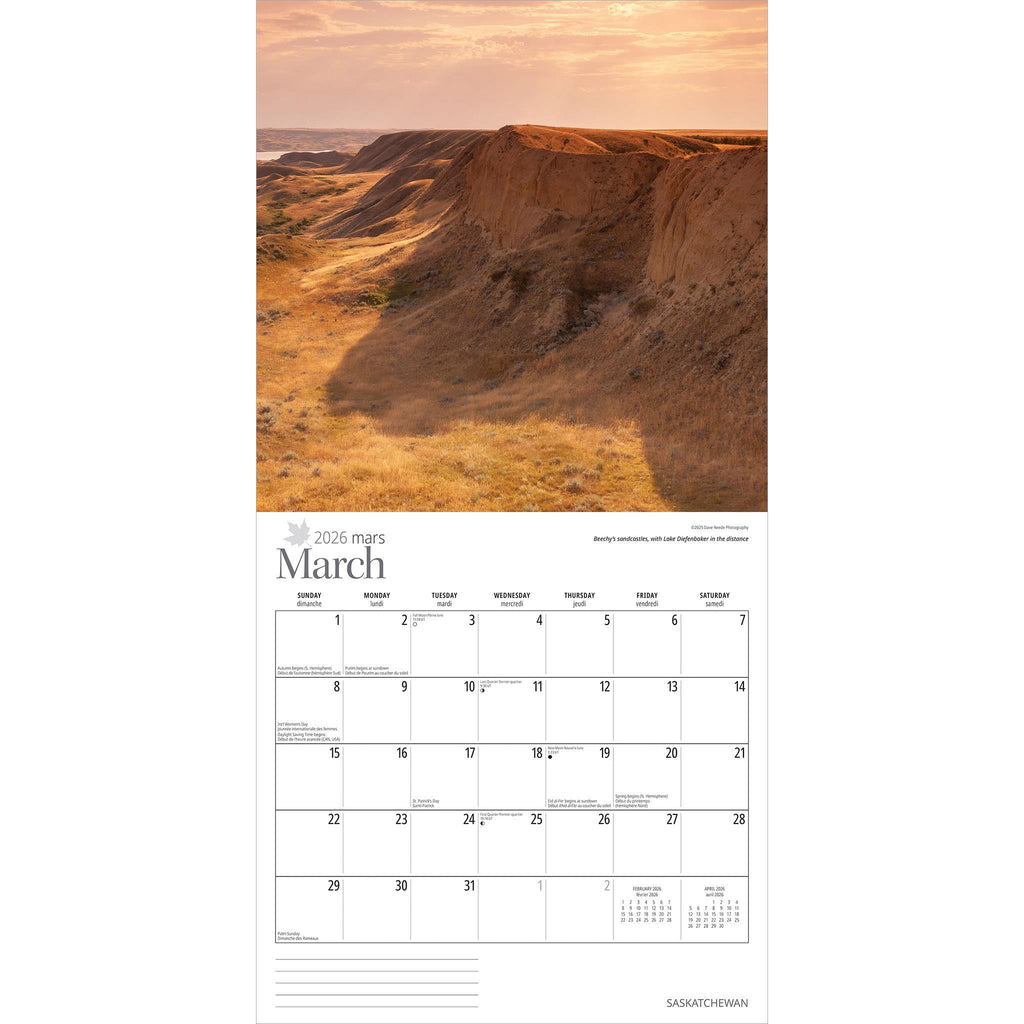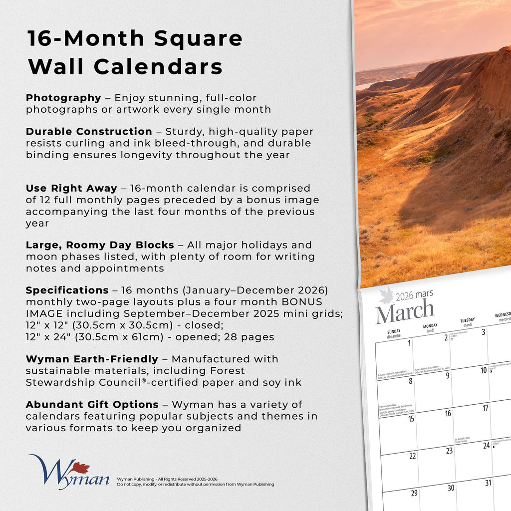 Saskatchewan is often referred to as the 'Breadbasket of Canada' for its abundance of agriculture; however, it is so much more! Besides the croplands and pastures, there are vibrant cities, pristine lakes, rivers, forests and even sand dunes. This square wall calendar is produced in English.