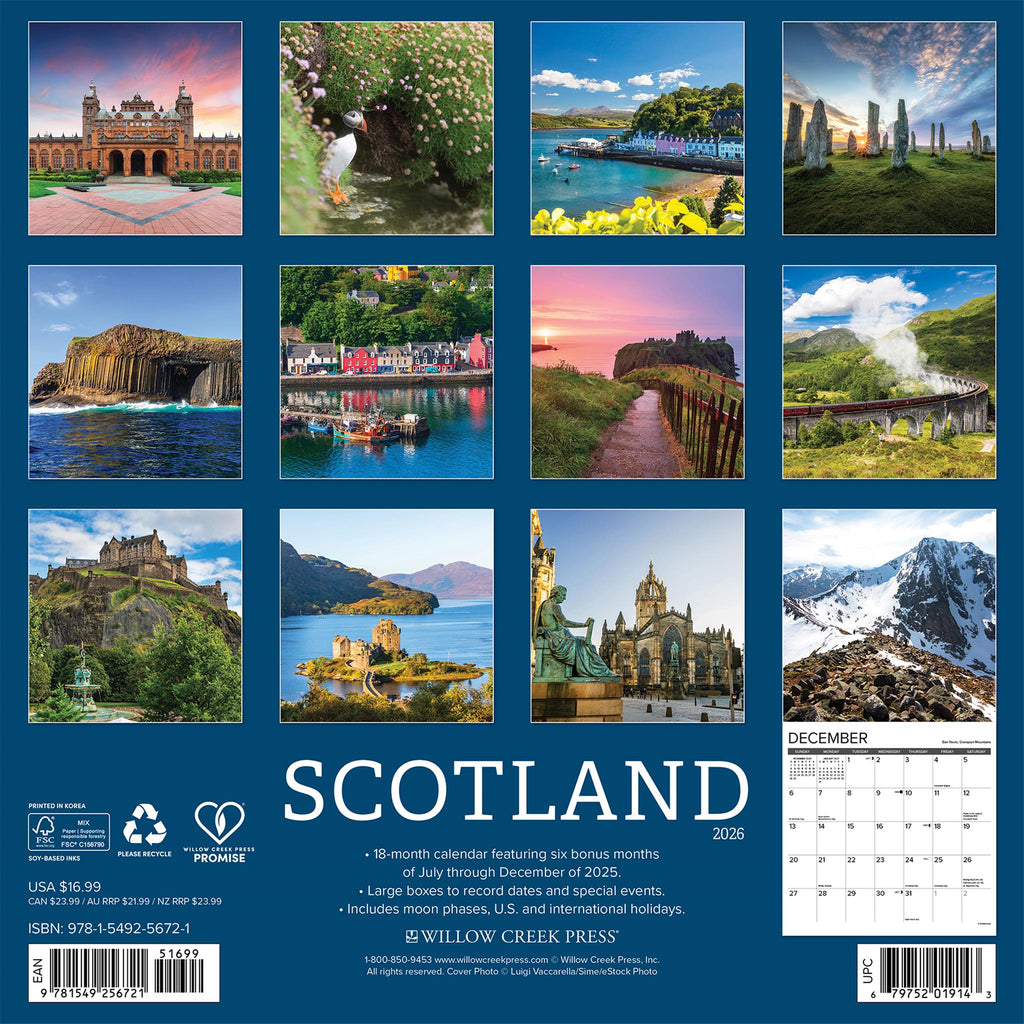 Welcome to the rugged beauty of Scotland, where ancient castles sit atop rolling green hills, and charming villages overlook peaceful waters. Enjoy these crisp and gorgeous images that capture the natural beauty of Scotland throughout the year. Stay organized in the upcoming year with a Willow Creek Press 2026 12" x 12" Wall Calendar. This calendar features large grids for easy notation of dates and events, helping you stay efficient and on top of your commitments. Let this calendar guide you to a more organized, successful and fulfilled year ahead. PERFECT GIFT - Look no further for the perfect gift for any special occasion. Make someone's year extra special with one of our 2026 Wall Calendars. Our calendars are the perfect choice for your friends or family, even for those difficult to buy for. PLANNING - Stay organized and inspired throughout the year. Ideal calendar for taking notes, recording dates to remember, tracking appointments and assisting in family activity organization. INCREDIBLE IMAGES - Crisp, detailed full-color images every month providing Wall art for Home, Office or School. LARGE GRIDS - 12" x 12" format, with large daily blocks providing ample writing room. SUPERIOR QUALITY - High quality paper stock that lays flat when hanging and offers crisp, bright colors. MONTHLY OVERVIEW - Plan ahead or look back with grids of the upcoming and previous months at a glance. ECO FRIENDLY - Willow Creek Press is committed to eco-friendly efforts to make our products more sustainable, our 2026 12" x 12" wall calendars are printed with soy-based inks on high-quality FSC certified paper for smooth writing. DATE RANGE - 2026 Wall Calendar with 6 bonus months from July-December 2025. BONUS FEATURES -US and International holidays and moon phases (CST) noted on each month for easy tracking. This year can be your most successful yet, with this beautiful and brilliant wall calendar. Learn how to become a highly effective person, one month at a time!"