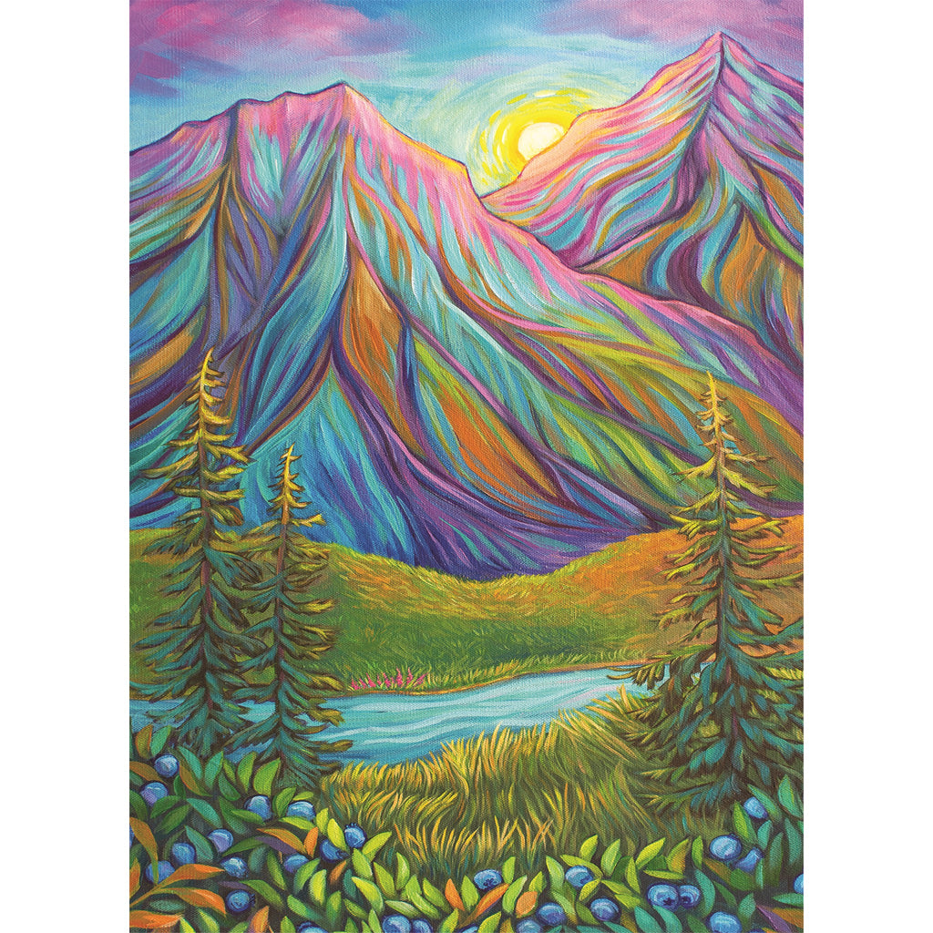 This 500 piece puzzle is perfect for those with a love of the outdoors. Amanda Rose Warren captures the flora and fauna of the North in vivid colours with whimsical touches. With rainbow-coloured mountains, green fields, and blue and orange foliage, Secret Solstice quietly invites you to experience the peaceful landscape. Cobble Hill puzzles feature interesting random-shaped pieces, so no two pieces are alike. Includes a handy poster.