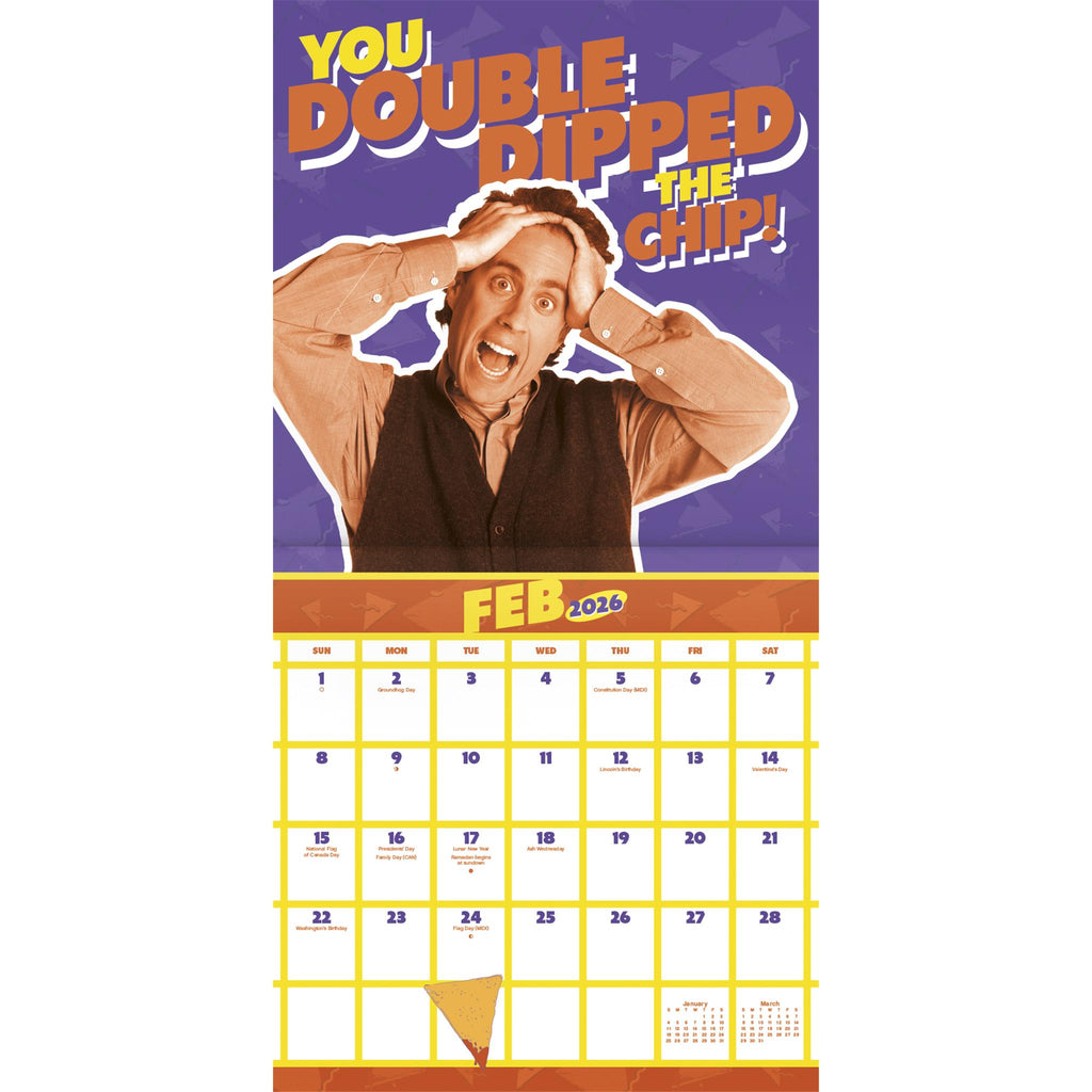 Yada yada yada. The show about nothing, TV sitcom Seinfeld, sure left its mark on American popular culture. Remember all of the clever quotes and goofy plotlines from Jerry, Elaine, George and Kramer in the 2026 Seinfeld Calendar or there’s no soup for you! Sixteen-month wall calendars feature monthly pages for January to December 2026, as well as a page combining the last four months of 2025. Each monthly page includes federal holidays and moon phases, with sufficient daily blocks for jotting down tasks and appointments to help you stay organized. Features 13 high-quality images printed on premium paper certified by the Forest Stewardship Council. Perfect for hanging on your wall, corkboard or bulletin board at home, school or the office.