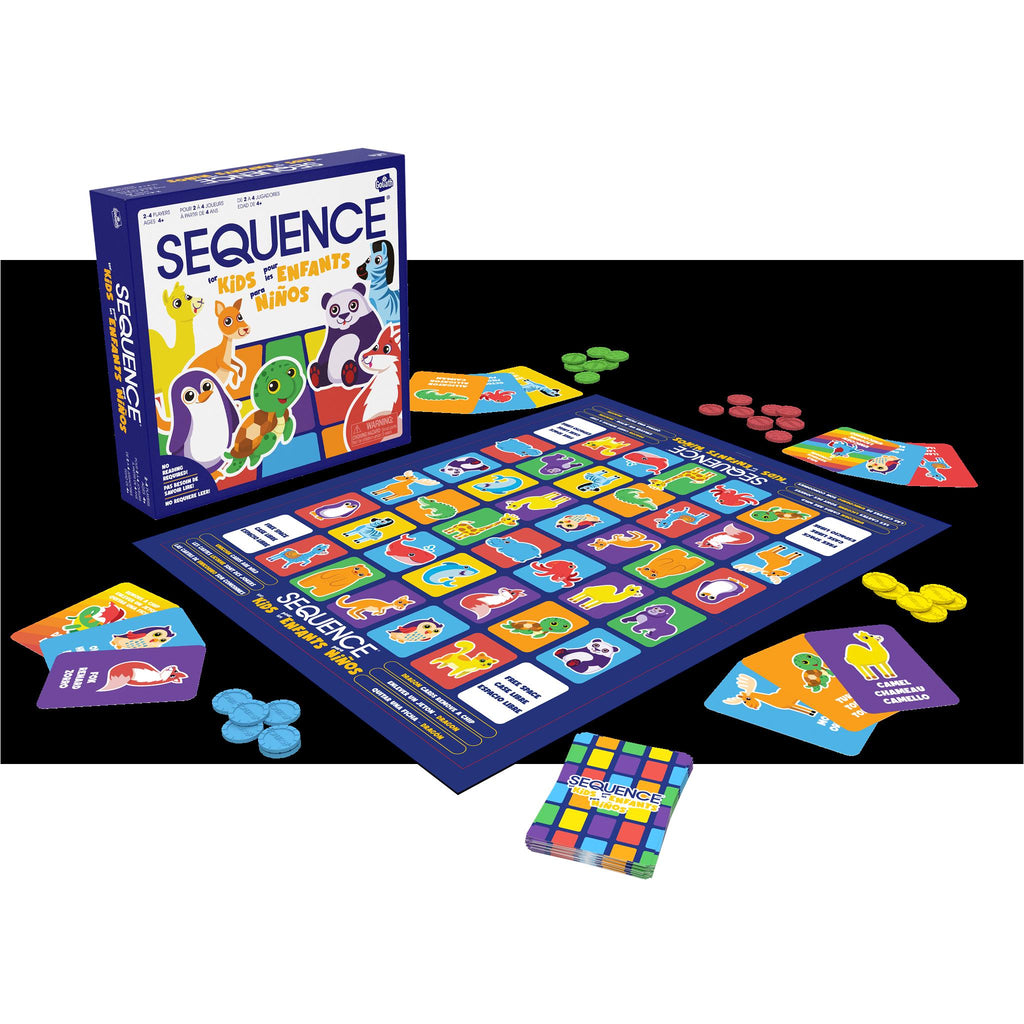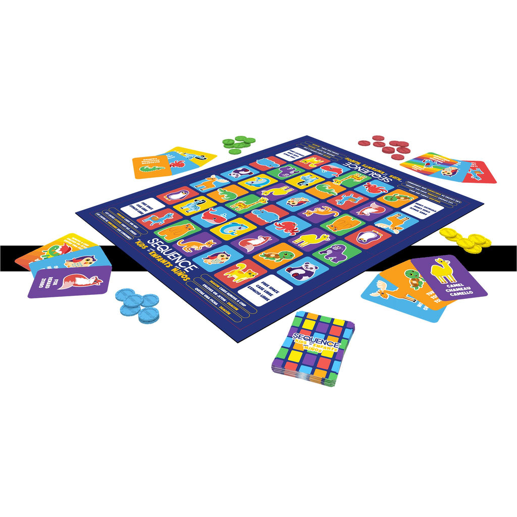 It's the classic game of SEQUENCE made just for kids! Play an animal card from your hand, and place your chip on the corresponding animal on the board. Wild cards add excitement to the game - use a unicorn card to place your chip anywhere, or use a dragon card to remove an opponent's chip.