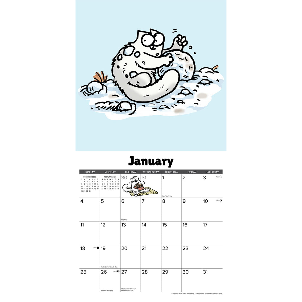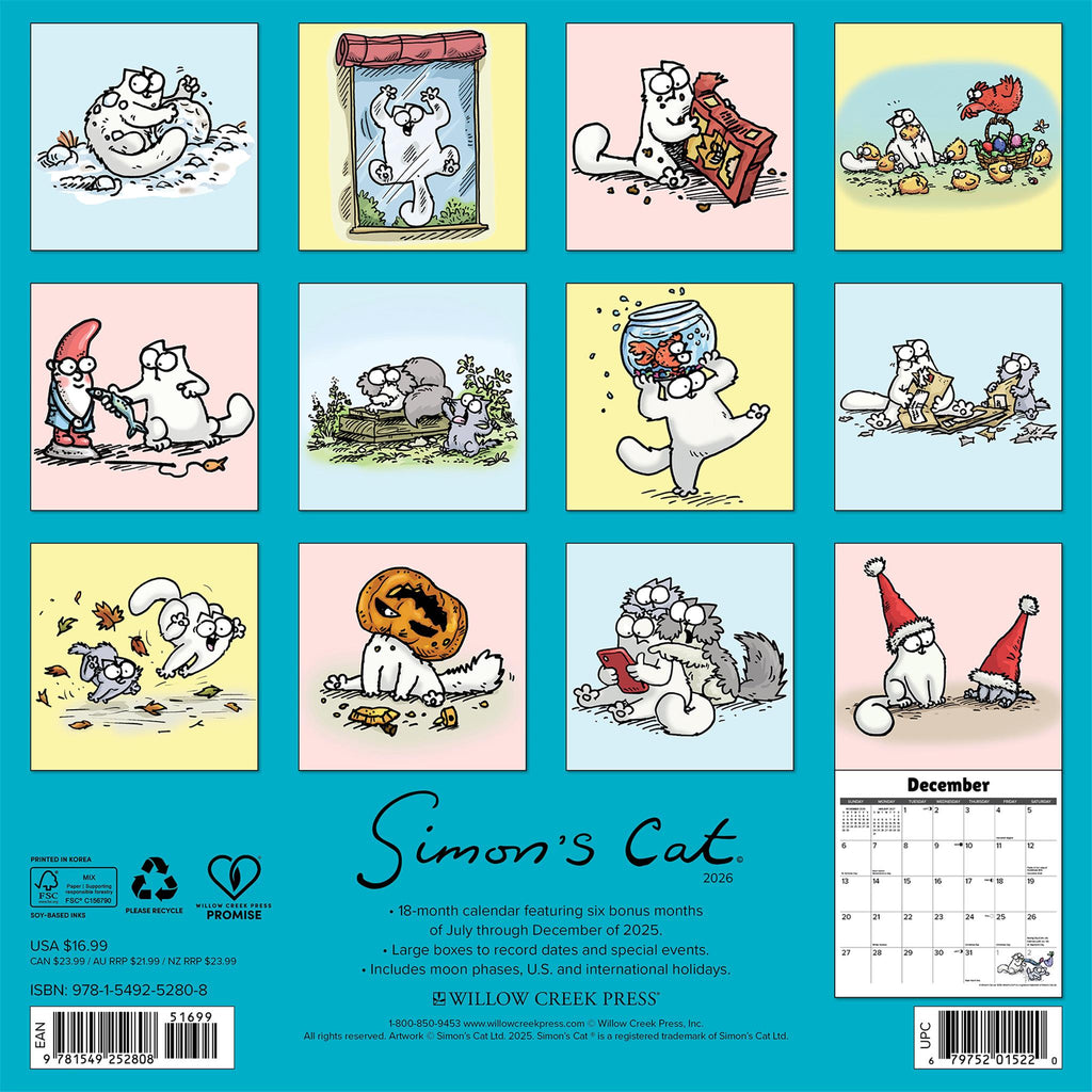 Simon's Cat, as seen on YouTube in more than 100 countries with nearly one billion views, is about a roly-poly house cat that always has his next meal on his mind. He's joined by his amiable owner Simon and encounters a cast of adorable friends and foes on his daily adventures. Simon's Cat now boasts 11 million followers and reached 1.8 billion people through Facebook in 2017. Stay organized in the upcoming year with a Willow Creek Press 2026 12" x 12" Wall Calendar. This calendar features large grids for easy notation of dates and events, helping you stay efficient and on top of your commitments. Let this calendar guide you to a more organized, successful and fulfilled year ahead. PERFECT GIFT - Look no further for the perfect gift for any special occasion. Make someone's year extra special with one of our 2026 Wall Calendars. Our calendars are the perfect choice for your friends or family, even for those difficult to buy for. PLANNING - Stay organized and inspired throughout the year. Ideal calendar for taking notes, recording dates to remember, tracking appointments and assisting in family activity organization. INCREDIBLE IMAGES - Crisp, detailed full-color images every month providing Wall art for Home, Office or School. LARGE GRIDS - 12" x 12" format, with large daily blocks providing ample writing room. SUPERIOR QUALITY - High quality paper stock that lays flat when hanging and offers crisp, bright colors. MONTHLY OVERVIEW - Plan ahead or look back with grids of the upcoming and previous months at a glance. ECO FRIENDLY - Willow Creek Press is committed to eco-friendly efforts to make our products more sustainable, our 2026 12" x 12" wall calendars are printed with soy-based inks on high-quality FSC certified paper for smooth writing. DATE RANGE - 2026 Wall Calendar with 6 bonus months from July-December 2025. BONUS FEATURES -US and International holidays and moon phases (CST) noted on each month for easy tracking. This year can be your most successful yet, with this beautiful and b