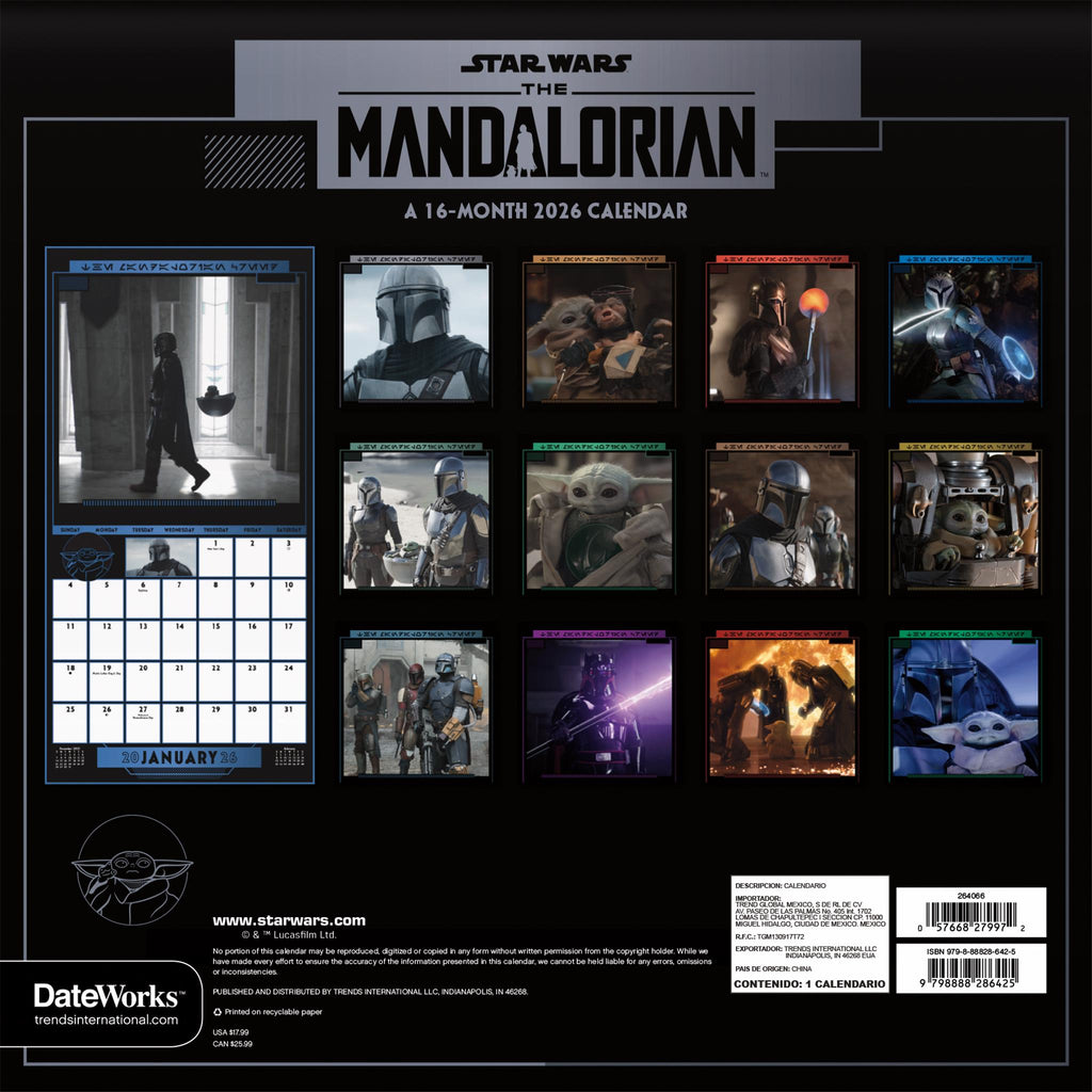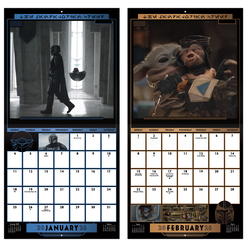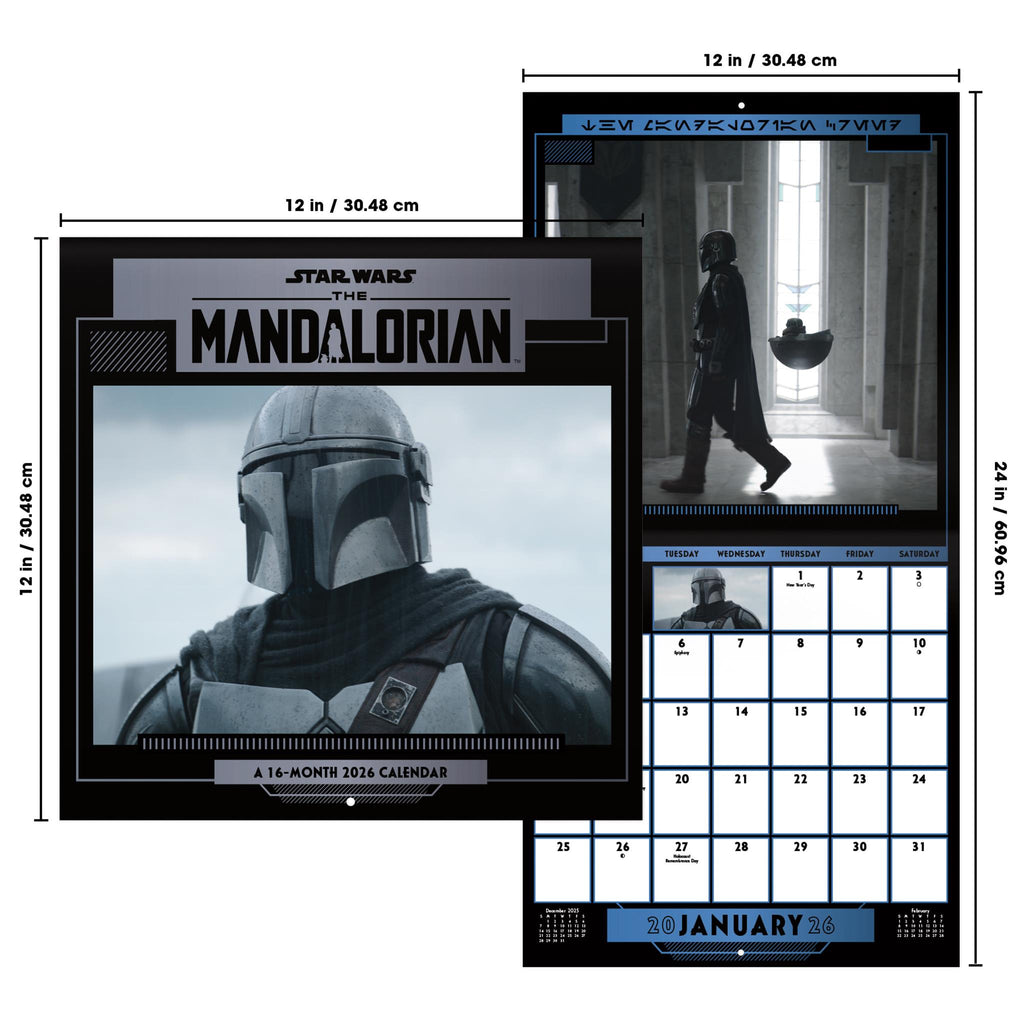 It begins when a lone bounty hunter decides to protect a Force-sensitive child, Grogu, from remnant Imperial forces. Follow their adventures with scenes and artwork from the hit show in 2026 Star Wars: The Mandalorian Calendar. Sixteen-month wall calendars feature monthly pages for January to December 2026, as well as a page combining the last four months of 2025. Each monthly page includes federal holidays and moon phases, with sufficient daily blocks for jotting down tasks and appointments to help you stay organized. Features 13 high-quality images printed on premium paper certified by the Forest Stewardship Council. Perfect for hanging on your wall, corkboard or bulletin board at home, school or the office.