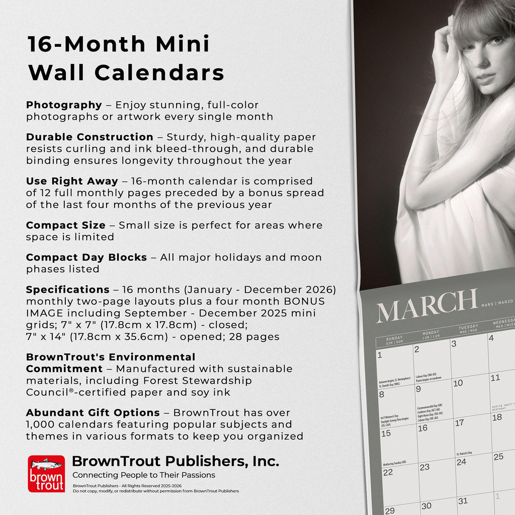 Fourteen-time Grammy award-winning artist Taylor Swift is the first and only artist in history to win GRAMMY Album of the Year award four times, the music industry's highest honor. Taylor is a singer, songwriter, musician, producer, and director. She is the most awarded artist in American Music Awards and Billboard Awards history, and a two-time BRIT recipient. She is Billboard's first-ever Woman of the Decade recipient and is their youngest-ever Woman of the Year honoree, and the only artist to have been awarded that title twice. The Taylor Swift official calendar features iconic photographs from her award-winning album, The Tortured Poets Department.