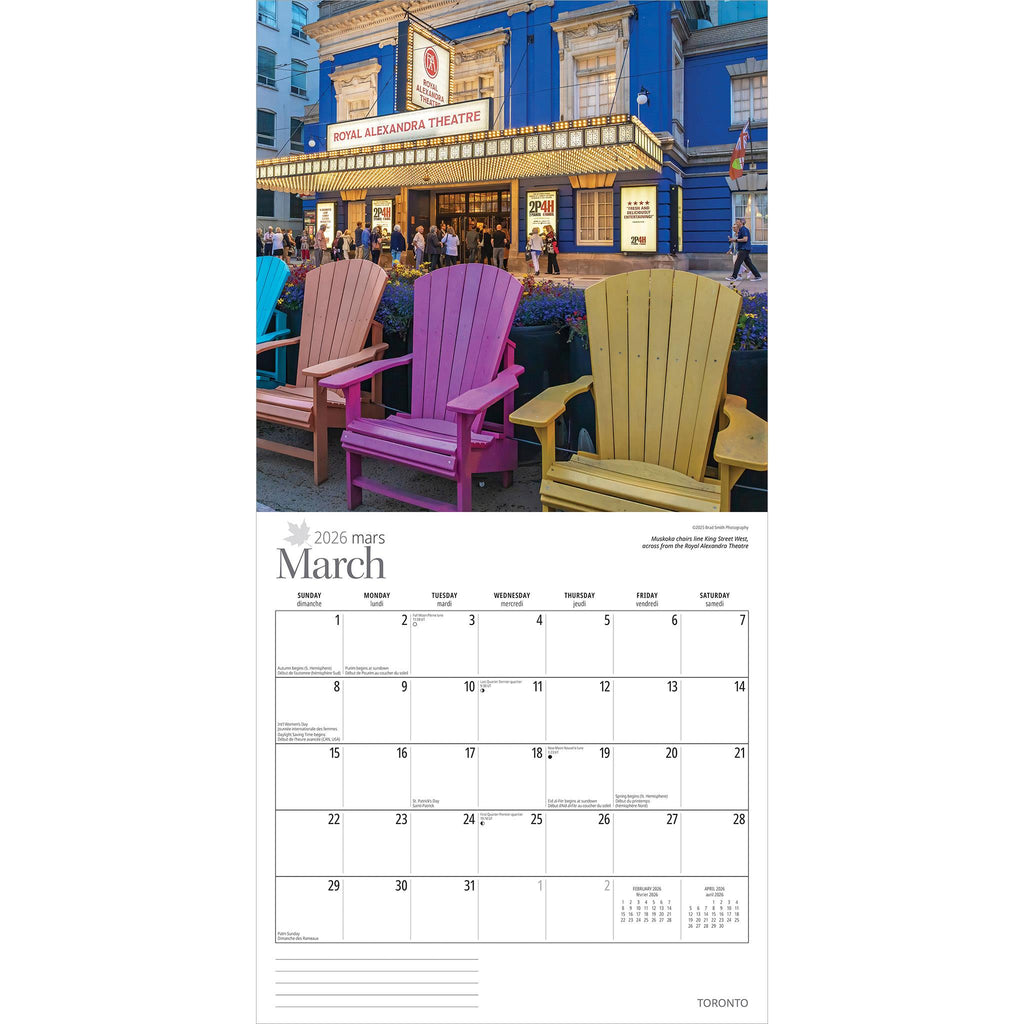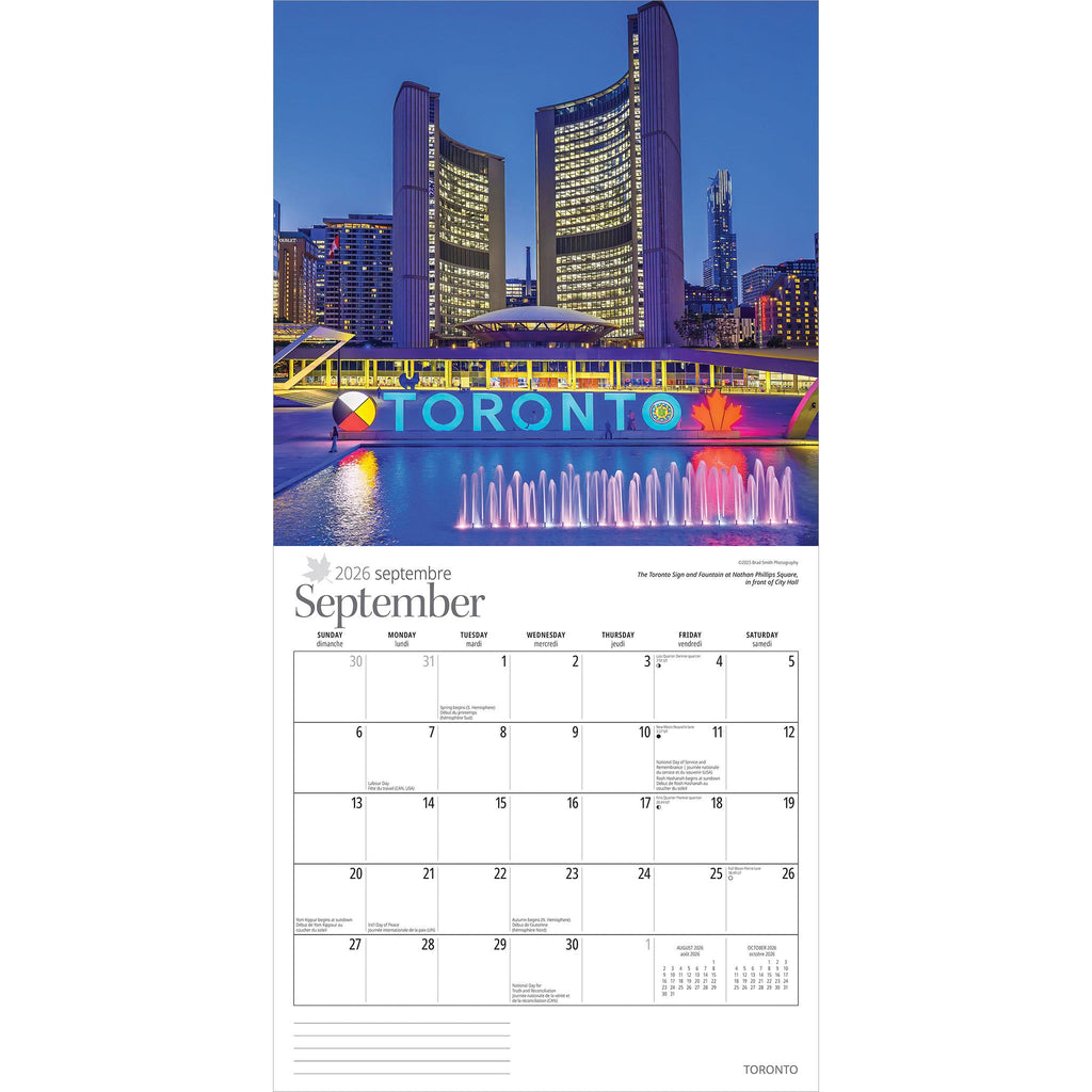 The largest of Canada's great cities, Toronto has so much to offer in the way of architecture, entertainment and sport. It makes the most of its natural terrain, with cool treed parks along the winding Don and Humber rivers, and beaches on Lake Ontario. This square wall calendar is produced in English.