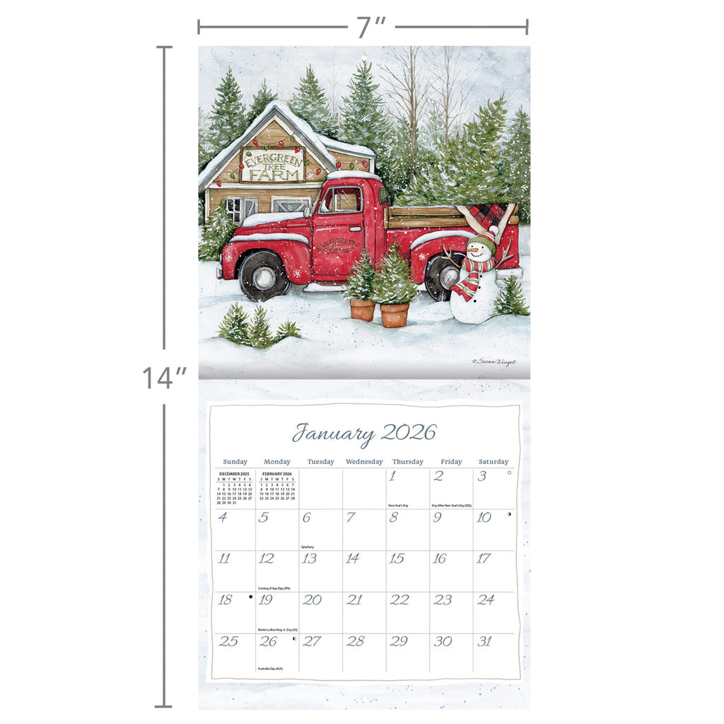 The Truckin' Along 2026 Mini Wall Calendar features Susan Winget's Red Truck paintings featuring familiar home and country scenes decorating each month of the year. LANG Mini Wall Calendars are made with elegant linen embossed paper stock in a space-efficient format.