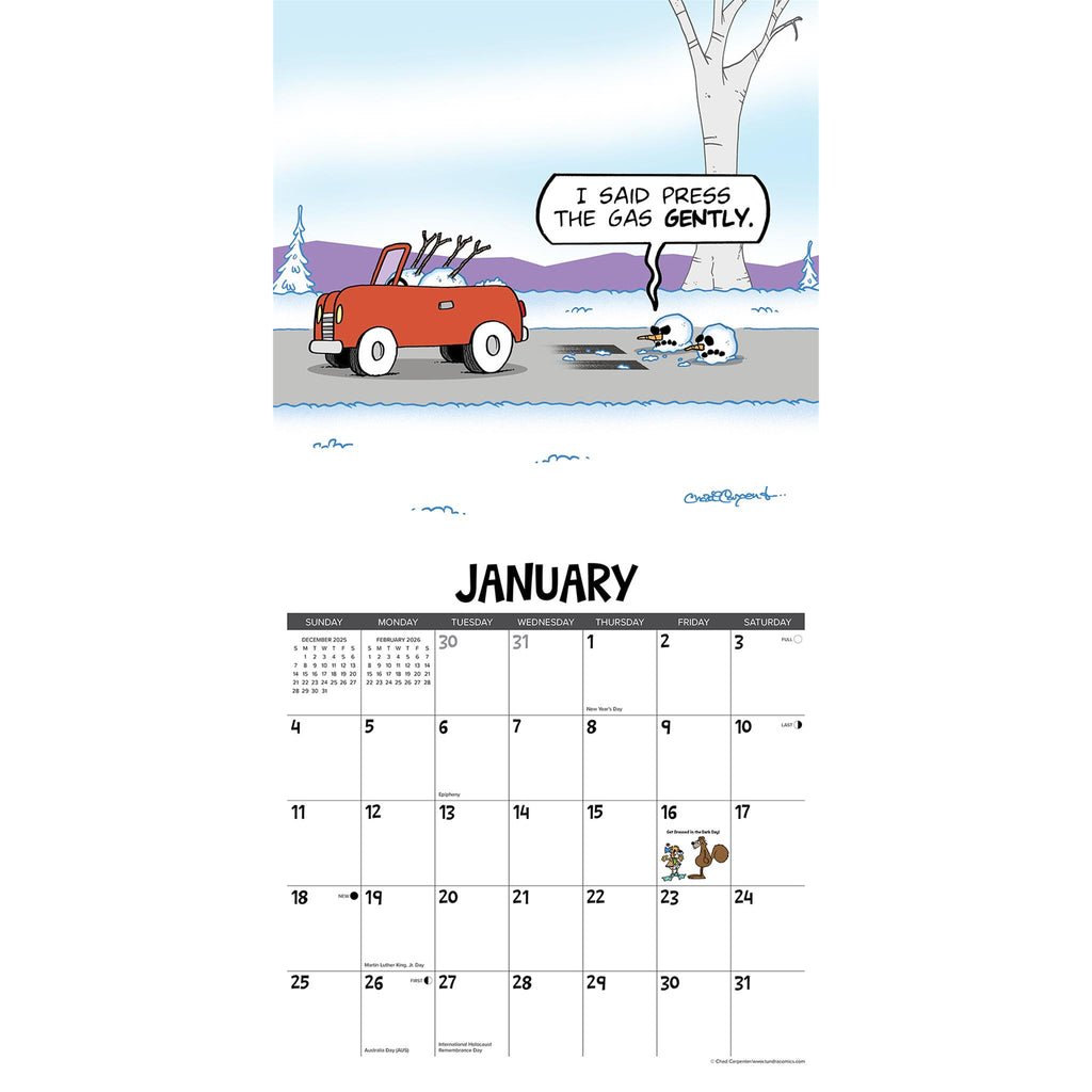 Tundra the comic strip Mother Nature warned you about is syndicated in nearly 500 newspapers throughout the U.S., Canada and Europe. Chad Carpenter chose 12 of his favorite full-color cartoons, hand-picked for funniness, featuring hilarious man vs. animal encounters in the Alaskan wilds. Stay organized in the upcoming year with a Willow Creek Press 2026 12" x 12" Wall Calendar. This calendar features large grids for easy notation of dates and events, helping you stay efficient and on top of your commitments. Let this calendar guide you to a more organized, successful and fulfilled year ahead. PERFECT GIFT - Look no further for the perfect gift for any special occasion. Make someone's year extra special with one of our 2026 Wall Calendars. Our calendars are the perfect choice for your friends or family, even for those difficult to buy for. PLANNING - Stay organized and inspired throughout the year. Ideal calendar for taking notes, recording dates to remember, tracking appointments and assisting in family activity organization. INCREDIBLE IMAGES - Crisp, detailed full-color images every month providing Wall art for Home, Office or School. LARGE GRIDS - 12" x 12" format, with large daily blocks providing ample writing room. SUPERIOR QUALITY - High quality paper stock that lays flat when hanging and offers crisp, bright colors. MONTHLY OVERVIEW - Plan ahead or look back with grids of the upcoming and previous months at a glance. ECO FRIENDLY - Willow Creek Press is committed to eco-friendly efforts to make our products more sustainable, our 2026 12" x 12" wall calendars are printed with soy-based inks on high-quality FSC certified paper for smooth writing. DATE RANGE - 2026 Wall Calendar with 6 bonus months from July-December 2025. BONUS FEATURES -US and International holidays and moon phases (CST) noted on each month for easy tracking. This year can be your most successful yet, with this beautiful and brilliant wall calendar. Learn how to become a highly effective person, one month at a