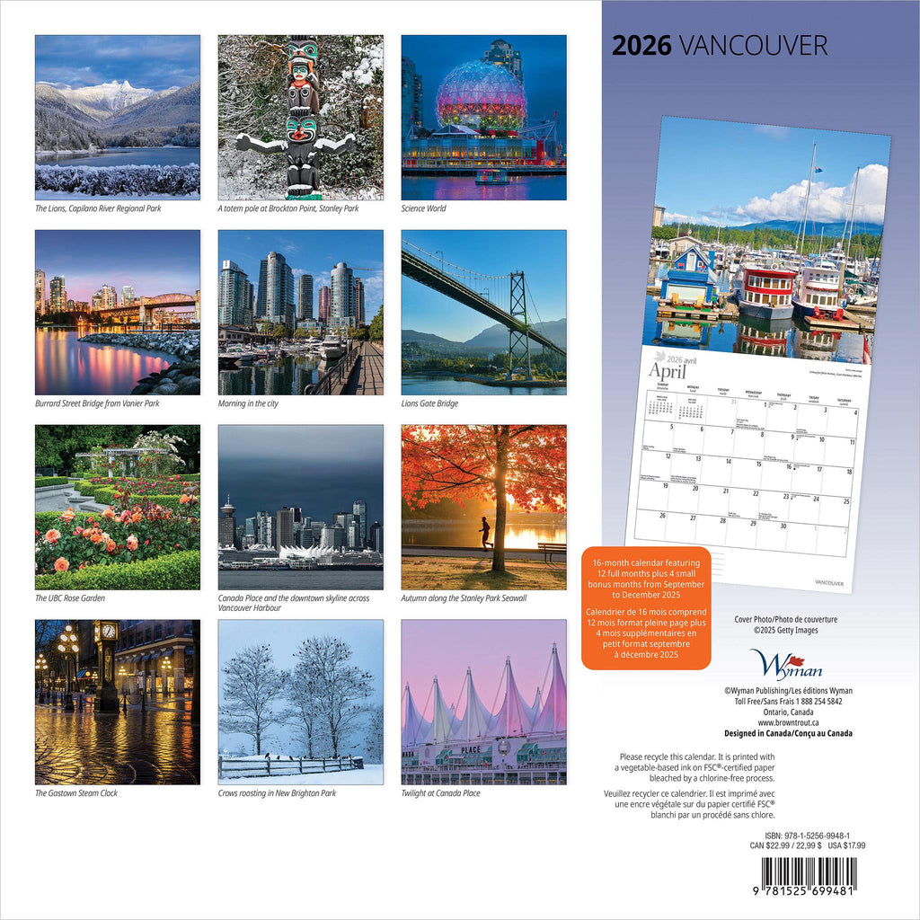 Vancouver, the largest city in British Columbia, offers an energetic metropolitan core with a backdrop of ocean views and mountain vistas. The city boasts an abundance of beautiful scenery, from lush gardens to rugged seascapes, plus a mix of historic and modern architecture. This square wall calendar is produced in English.