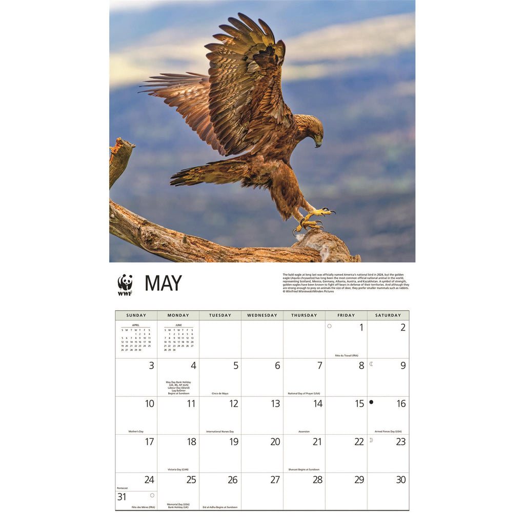 Take an intimate look at the bald eagle through a collection of outstanding photographs in the 2026 Eagles WWF Wall Calendar. Celebrate this American icon symbolizing strength and freedom all year long with this calendar. A large grid filled with moon phases and international holidays accompanies each vibrant photograph. This calendar is printed with soya based inks on FSC certified paper.
