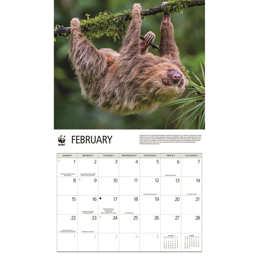 Get up close and personal with the world's most adorable creatures with the Sloths WWF 2026 Wall Calendar. Featuring stunning images of sloths in their natural habitat, this calendar offers a unique glimpse into the lives of these fascinating animals. Each month showcases a vibrant photograph that captures the beauty and charm of sloths, accompanied by a large grid that includes moon phases and international holidays. Whether you're planning your next adventure or simply organizing your schedule, this calendar has everything you need to stay on track. But this calendar isn't just beautiful; it's also eco-friendly. Printed with soya-based inks on FSC certified paper, it's a sustainable choice for anyone who cares about our planet. So why wait? Order your Sloths WWF 2026 Wall Calendar today and experience the wonder of these amazing creatures all year long!