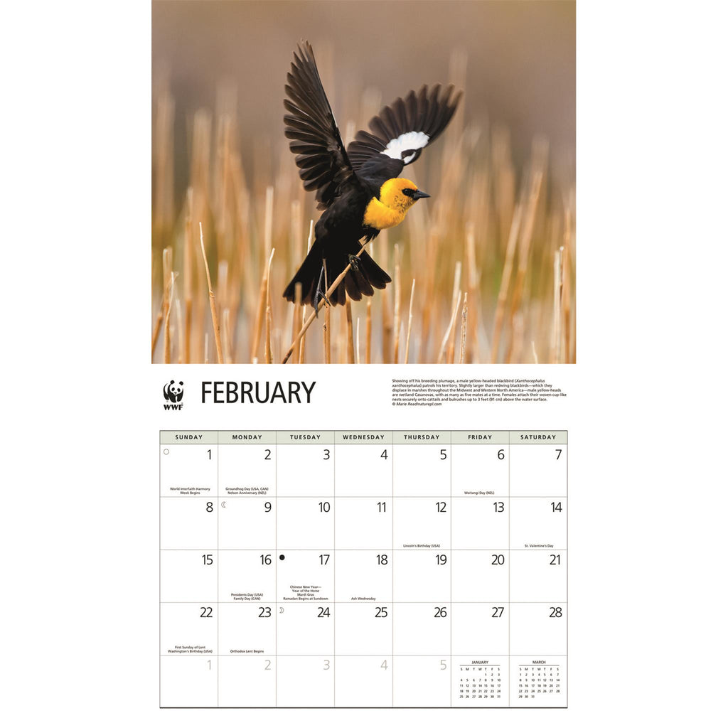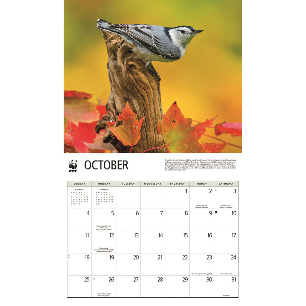 One day, near winter's end, the air will brighten with the faint sound of a songbird, but the trees will erupt in a symphony of trills and whistles. Songbirds WWF 2024 Wall Calendar profiles some of the world's most delightful vocalists dressed in their feathered finery. This bird calendar is perfect as decor in your home, kitchen, or office and easily helps to keep track of important dates, contacts, and other events at a glance. Each calendar month is easy to glance at and see what responsibilities you have coming up, so make sure you stay organized through the year! Personalization is easy with different colors for appointments and trips, add stickers or stickie notes for a quick reference, or create your own system of symbols and abbreviations.