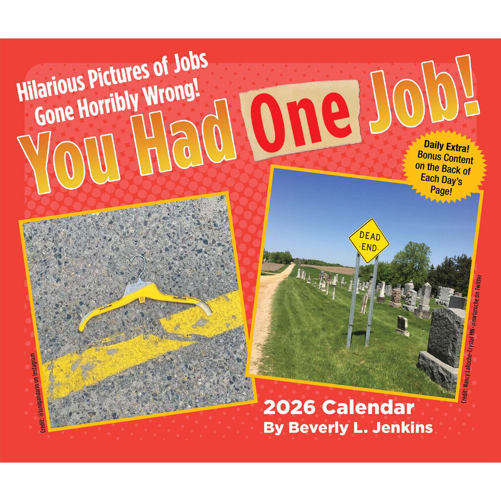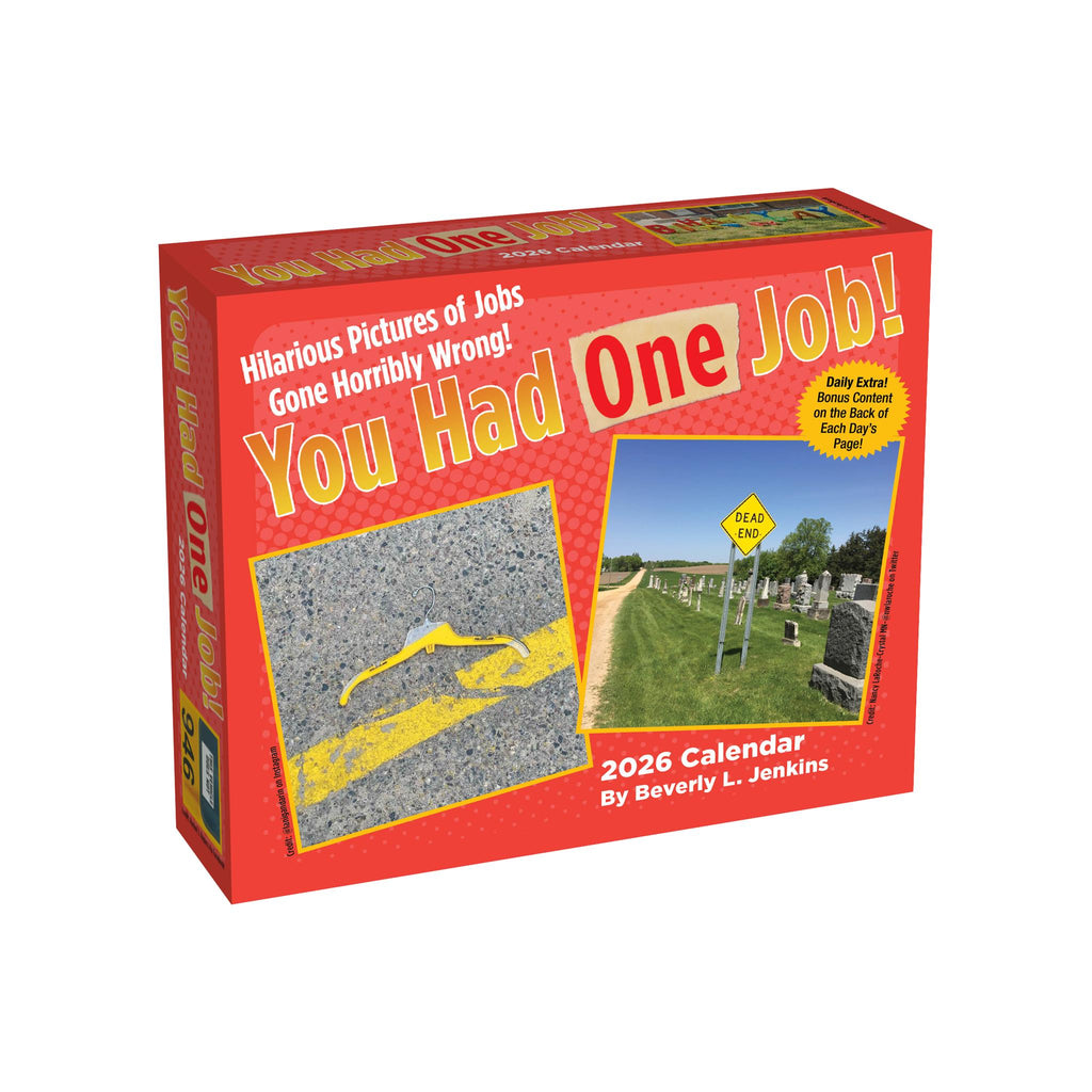 Buckle up! The hot mess express is about to leave the station, and it's guaranteed to keep you laughing, groaning, and shouting, "You Had One Job!" every day of 2026. Each page of this day-to-day calendar features a new, jaw-dropping mishap, mess, or workplace #fail paired with side-splitting commentary by humorist Beverly L. Jenkins. Laugh away the workweek with this bestselling calendar and remember—there's always someone who's got it worse! Features include: No single-use plastic. Page size: 5.4 x 4.5 in. Recyclable chipboard easel backer for desk or tabletop display. Printed on FSC® certified paper with soy-based ink. Full-color tear-off pages. Back of pages contain Daily Extra content such as puzzles, jokes, quotations, and trivia. Day/Date reference on each page. Combined weekend pages. Official major world holidays and observances. Every page features a hilarious example of a job gone very, very wrong.