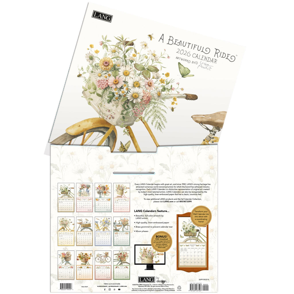 Embarquez pour un voyage visuel avec le calendrier mural LANG A Beautiful Ride 2026, illustré par Lisa Audit. Orné de superbes aquarelles de vélos, ce calendrier allie art et fonctionnalité. Imprimé sur un élégant papier gaufré lin, il respire le raffinement. Accrochez-le facilement grâce à son œillet en laiton et transformez n'importe quel espace en galerie d'art. En bonus, profitez de fonds d'écran gratuits à télécharger pour apporter une touche artistique à vos appareils numériques. Appréciez la beauté et l'élégance des aquarelles de Lisa Audit tout au long de l'année avec le calendrier mural LANG A Beautiful Ride !