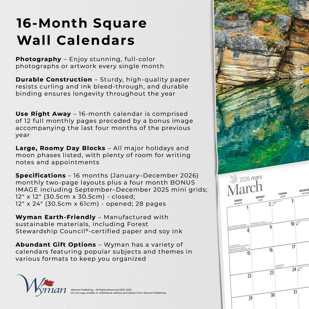 Découvrez la splendeur de l'une des plus belles provinces du Canada. Bordée par les majestueuses montagnes Rocheuses à l'ouest et les vastes prairies à l'est, cette province pittoresque est prisée des aventuriers et a inspiré de nombreuses personnes par ses paysages. Ce calendrier mural carré est en anglais.