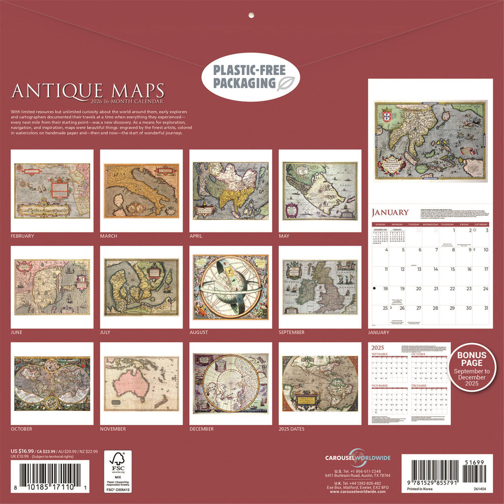 Les premiers explorateurs et cartographes ont consigné leurs voyages à une époque où tout était une découverte. Outil d'exploration, de navigation et source d'inspiration, les cartes étaient gravées par les plus grands artistes et colorées à l'aquarelle sur du papier fait main. Le calendrier mural Cartes Anciennes 2026 rend hommage à ces œuvres d'art exceptionnelles. Ses larges cases offrent un espace généreux pour vos notes et rendez-vous, et il est livré sans emballage plastique.