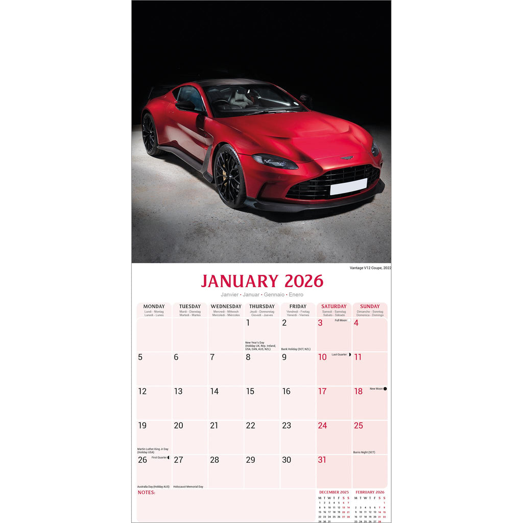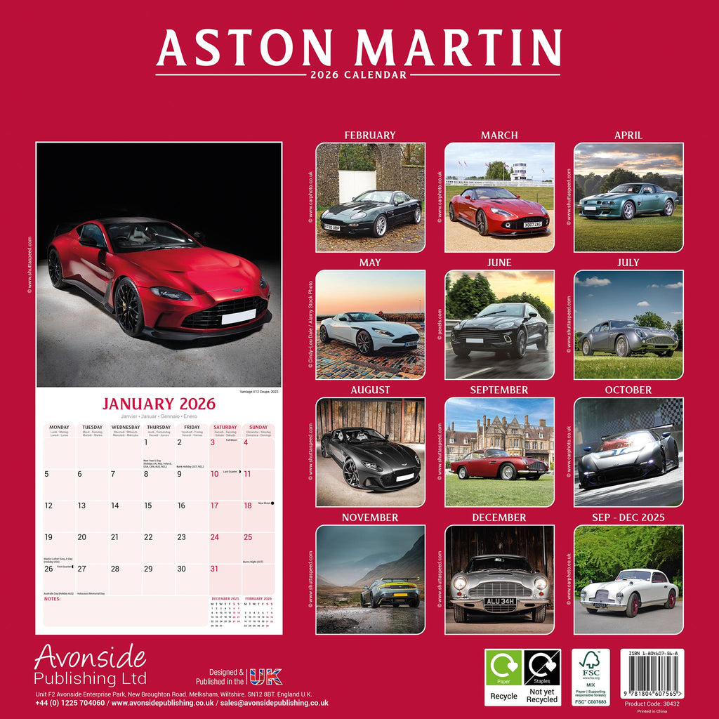 Notre calendrier premium 2026 comprend 13 pages, dont une page d'agenda reprenant les quatre mois de l'année précédente. Il contient 13 images en couleur de l'emblématique Aston Martin, illustrant quelques-unes des voitures rapides, élégantes et convoitées qu'elle a produites au cours des 60 dernières années. Aston Martin a été fondée en 1913 par Lionel Martin et Robert Bamford. L'année précédente, les deux hommes s'étaient associés sous le nom de Bamford & Martin pour vendre des voitures Singer dans leurs locaux de Callow Street, à Londres, où ils assuraient également l'entretien des véhicules GWK et Calthorpe. Martin participait à des courses de voitures spéciales sur le circuit d'Aston Hill, près d'Aston Clinton, et le duo décida de fabriquer ses propres véhicules. La première voiture à porter le nom d'Aston Martin fut créée par Martin en adaptant un moteur Coventry-Simplex à quatre cylindres au châssis d'une Isotta Fraschini de 1908. Ce calendrier comprend une grande grille multilingue (anglais, français, allemand, italien et espagnol) pour noter les dates importantes. 610 mm x 305 mm ouvert – 305 mm x 305 mm fermé. Ce calendrier haut de gamme, imprimé sur du papier certifié FSC et conditionné dans un emballage sans plastique, est un véritable bijou. Faites-vous plaisir ou offrez-le en cadeau ! Ce calendrier ravira les passionnés d’automobile et trouvera parfaitement sa place dans votre espace de travail, votre bureau ou votre maison.