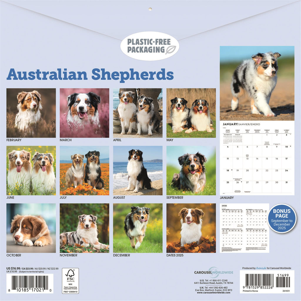 Célébrez l'intelligence et le charme des Bergers Australiens tout au long de l'année 2026 grâce à ce magnifique calendrier mural. Chien réputé pour sa loyauté et son agilité, le Berger Australien égaye chaque mois avec son regard expressif et sa personnalité pétillante. Ses larges cases vous offrent un espace généreux pour vos notes et rendez-vous, et ce calendrier est sans emballage plastique.
