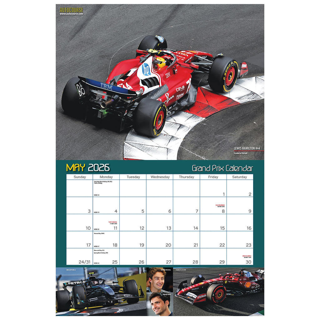 Le calendrier Autocourse Grand Prix (40,6 x 30,5 cm) présente de superbes images du championnat du monde de Formule 1. Des photos exceptionnelles de voitures de course, signées XPB Images, agence photographique de renom spécialisée dans le sport automobile, couvrent les dix écuries de Formule 1, dont Red Bull Racing, Mercedes, Ferrari et Aston Martin. Ces clichés sont exclusivement issus des Grands Prix de la saison. On y retrouve également les portraits des pilotes actuels, notamment les champions Lewis Hamilton, Max Verstappen et Fernando Alonso, dont les dates de naissance figurent aussi sur les pages du calendrier. Ce calendrier mural grand format retranscrit à merveille les couleurs éclatantes et le glamour du monde de la Formule 1.