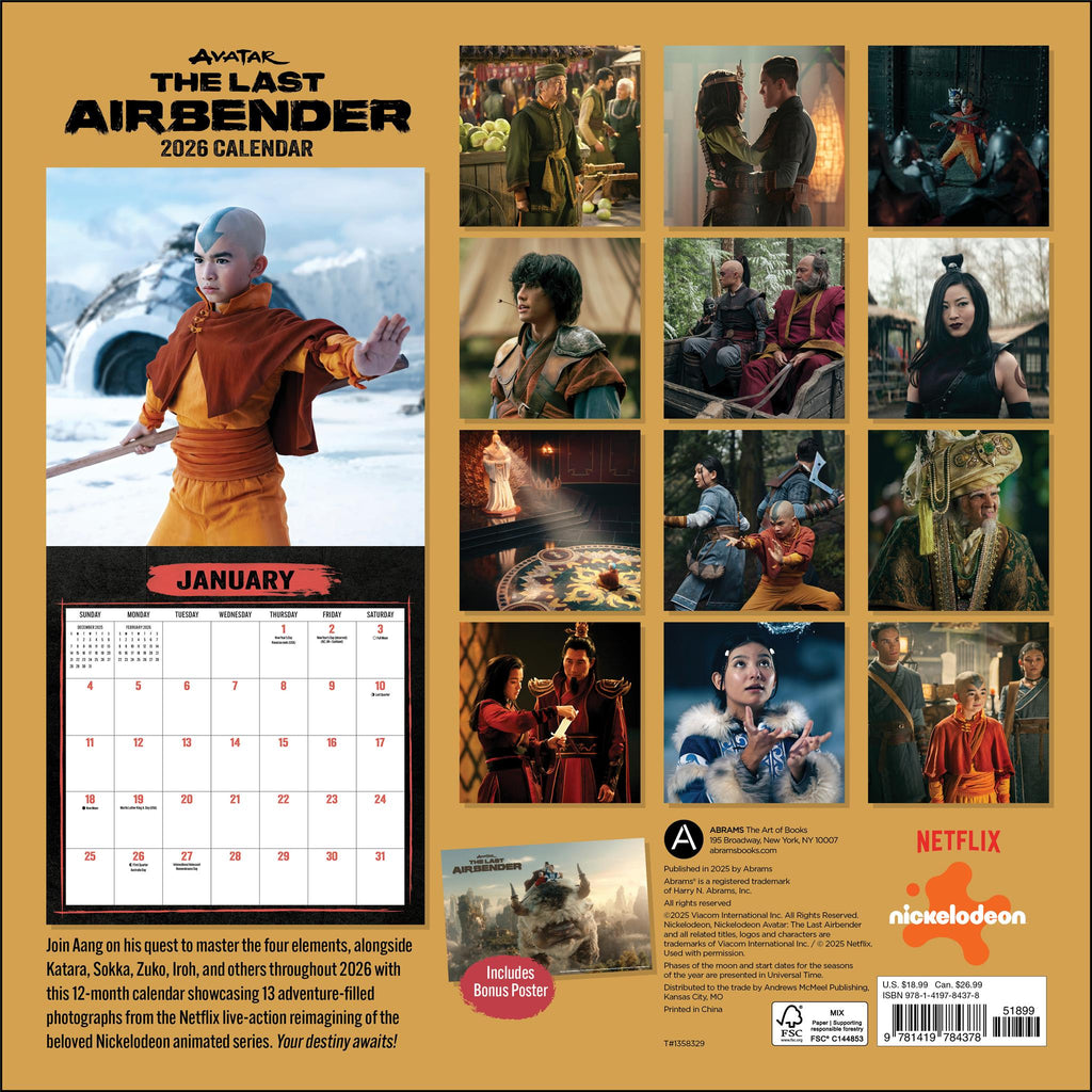 Maîtrisez les quatre éléments avec Aang et ses amis grâce à ce calendrier mural de 12 mois présentant 13 photos pleines d'aventures tirées de l'adaptation en prises de vues réelles de la série animée culte de Nickelodeon, Avatar : Le Dernier Maître de l'Air. La saga épique a captivé des spectateurs du monde entier avec ses histoires de conflit, de paix, de justice et de conquête. Rejoignez Aang dans sa quête pour maîtriser les quatre éléments, aux côtés de Katara, Sokka, Zuko, Iroh et bien d'autres, tout au long de l'année 2026. Votre destin vous attend ! Caractéristiques : 30,5 x 30,5 cm (30,5 x 61 cm ouvert). Imprimé sur du papier certifié FSC® avec de l'encre à base de soja. Planification de septembre à décembre 2025. Couvre janvier à décembre 2026. Grand espace quadrillé pour vos notes, rendez-vous et rappels. Jours fériés et commémorations officiels. Phases de la lune, selon le Temps Universel Coordonné. Comprend 13 photos en couleur tirées de l'adaptation à succès de Netflix. Poster bonus inclus.