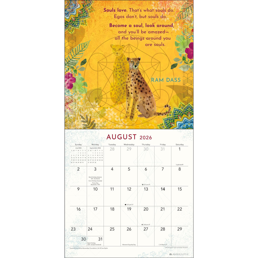 Mettant en valeur des citations profondes du maître spirituel et auteur à succès Baba Ram Dass, et accompagnées de peintures colorées et de géométrie sacrée de l'artiste contemporaine Sue Zipkin, ce calendrier est un régal pour les yeux et l'âme, vous guidant sur le chemin de l'éveil spirituel. Caractéristiques : 30,5 cm x 30,5 cm (30,5 cm x 61 cm ouvert). La conception de la couverture permet d'éviter tout emballage plastique. Imprimé sur du papier certifié FSC® avec de l'encre à base de soja. Couvre la période de janvier à décembre 2026. Grand espace quadrillé pour vos notes, rendez-vous et rappels. Jours fériés et commémorations officiels dans le monde entier. Phases de la lune, basées sur le Temps Universel. Conseils du maître spirituel Ram Dass. Cadeau idéal pour ceux qui aspirent à une vie de bienveillance et d'amour inconditionnel. Décoration murale pour votre maison, votre école ou votre bureau, offrant un temps propice à la planification et à la rêverie. Nous plantons des arbres pour compenser notre empreinte carbone et notre consommation de ressources — plus d'un million et ce n'est pas fini ! ZÉRO PLASTIQUE À USAGE UNIQUE — Nous avons éliminé le film rétractable à usage unique afin de réduire la pollution plastique. APPROVISIONNEMENT DURABLE — Notre papier est fabriqué à partir d'un mélange de matériaux recyclés et de bois issu de forêts gérées durablement sur les plans social et environnemental, et certifiées Forest Stewardship Council® (FSC®).