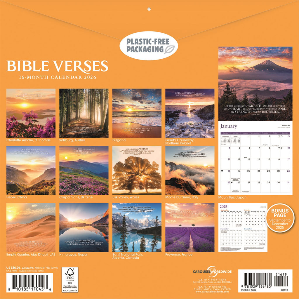 Le calendrier mural « Versets bibliques » pour 2026 apaisera votre esprit grâce à un message de sagesse, de foi et d'inspiration. Chaque mois présente une image de paysage exceptionnel du monde entier, un verset biblique et une grille spacieuse pour noter vos engagements. Ce calendrier est sans emballage plastique.