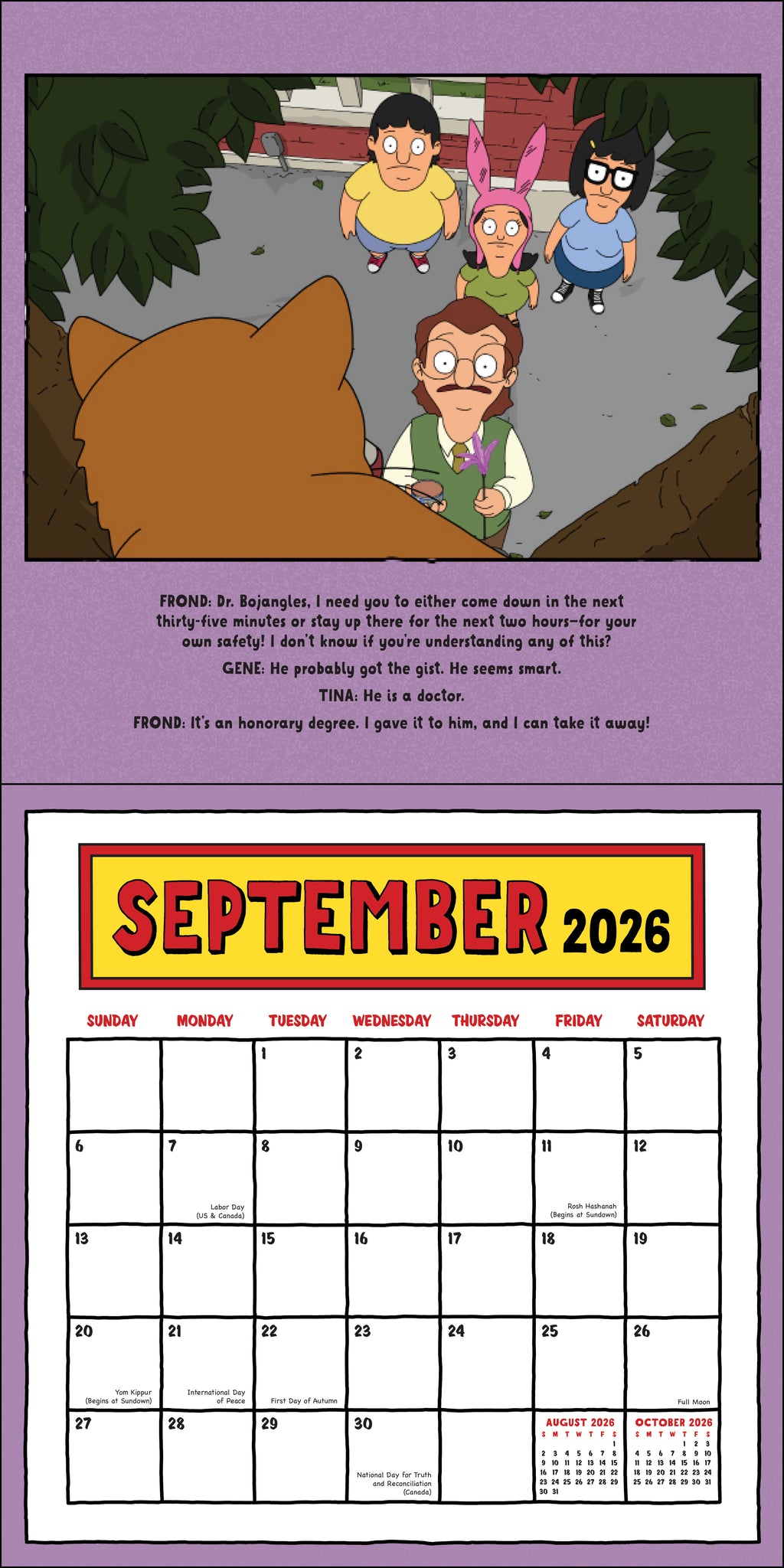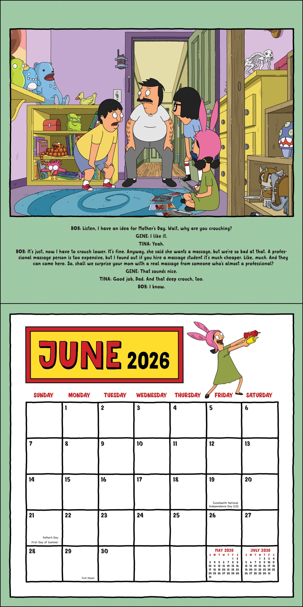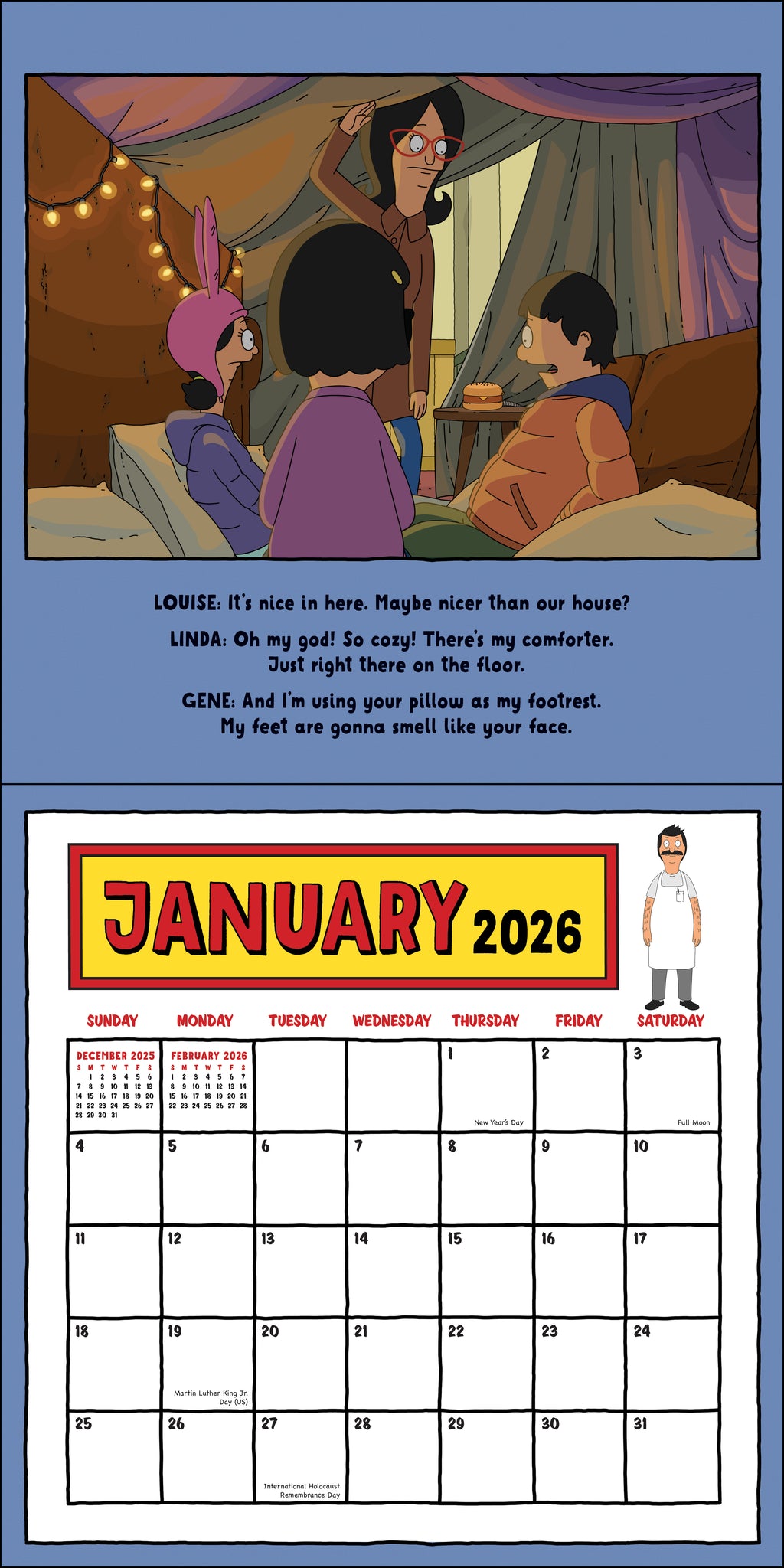 Centrée sur Bob (H. Jon Benjamin, de la série Archer), le patriarche qui gère son entreprise avec sa femme Linda (voix de John Roberts), collectionneuse de bébés en porcelaine et passionnée de théâtre-dîner, la série met également en scène leur fille adolescente Tina (Dan Mintz), obsédée par les garçons et les chevaux ; leur fils Gene (Eugen Mirman), qui n'a peur que des serpents ; et leur benjamine Louise (Kristen Schaal, de 30 Rock), qui ne quitte jamais ses oreilles de lapin. Jamais. AUTOCOLLANTS ! Comprend une planche d'autocollants en couleur avec 25 autocollants inspirés de la série. Illustrations originales en couleur pour chaque mois, accompagnées de citations. Grandes grilles pour noter rendez-vous et rappels. Inclut les principaux jours fériés internationaux. Dimensions ouvert : 30,5 cm x 61 cm. Idéal à offrir ou à s'offrir.